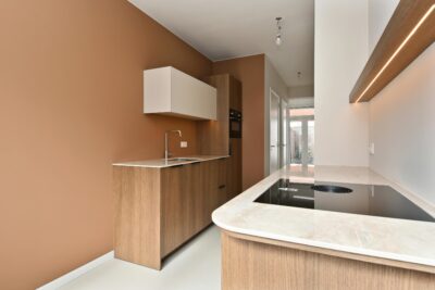 Moderne keuken met een keukenmeubel aan beide zijden. De keuken is voorzien van een inductiekookplaat met geïntegreerde afzuiging (BORA), combioven, vaatwasser en koelkast.