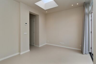 Tuingerichte woonkamer met een daklicht, openslaande deuren en een loopdeur naar de tuin.