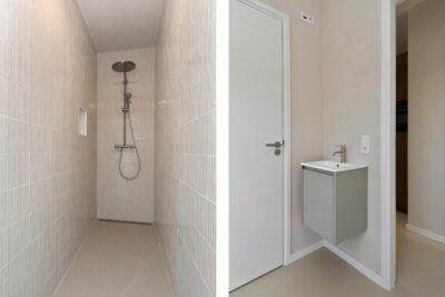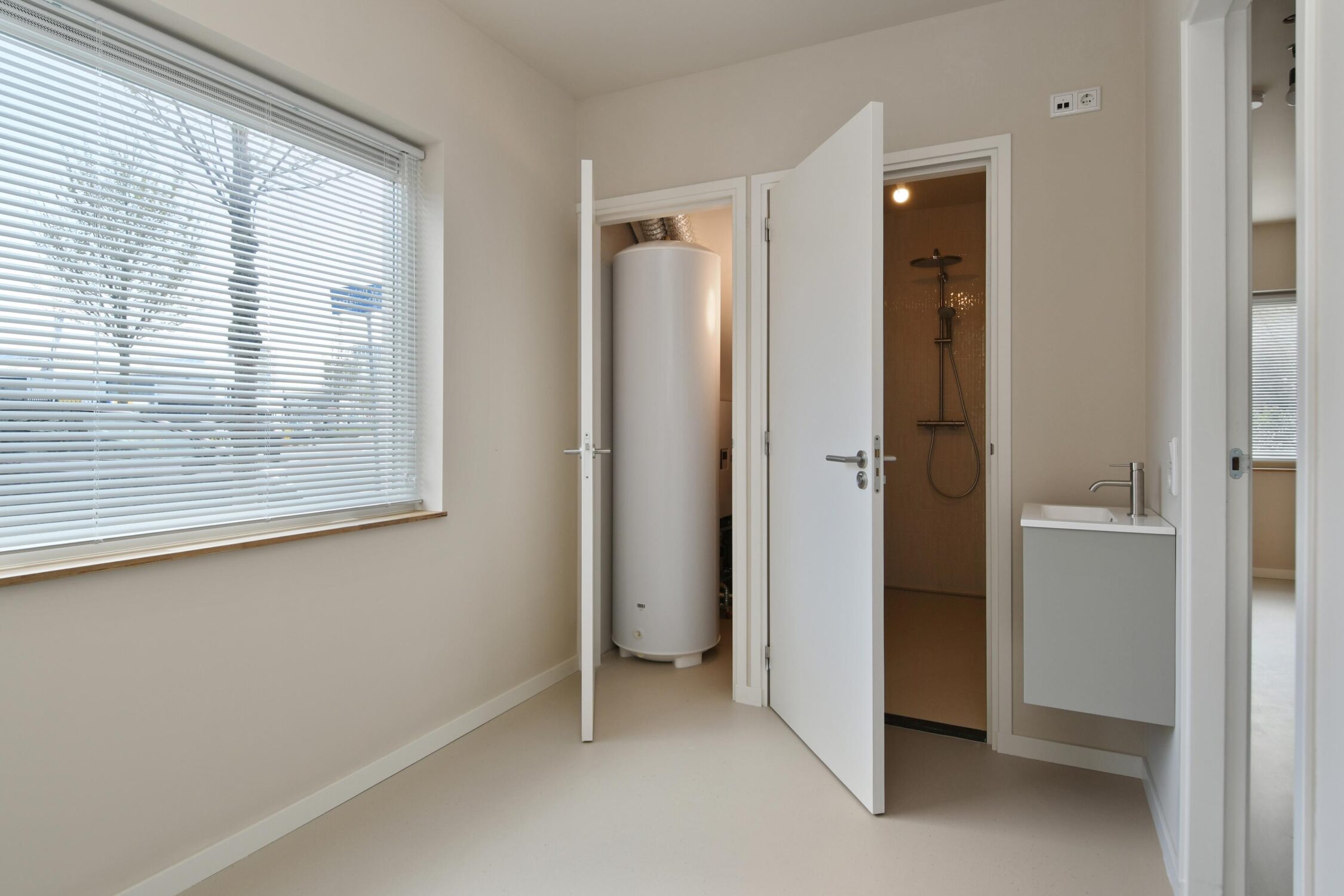 Slaapkamer met een wastafel in meubel, geheel betegelde douche en-suite en toegang tot een trapkast met de warmtepomp.