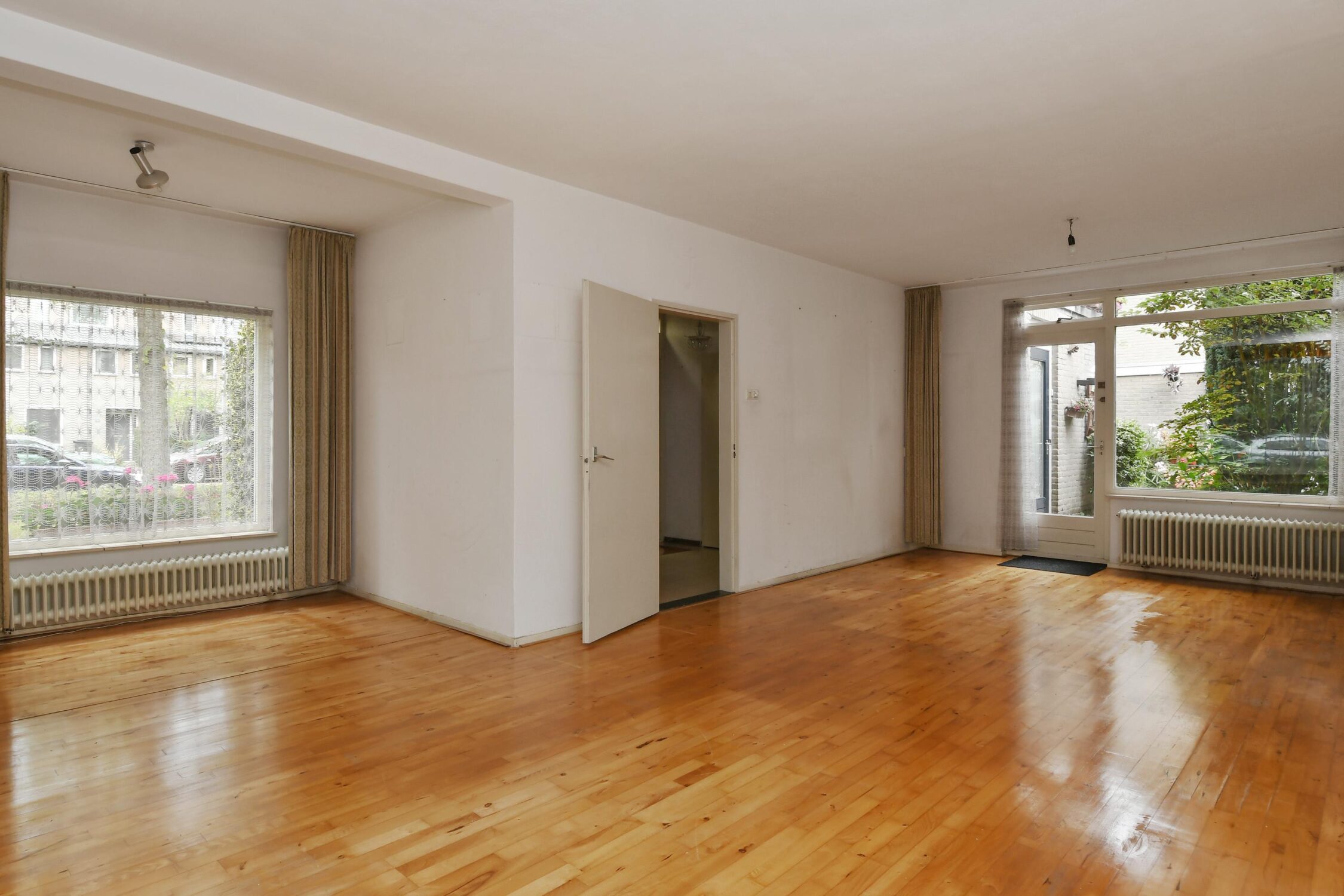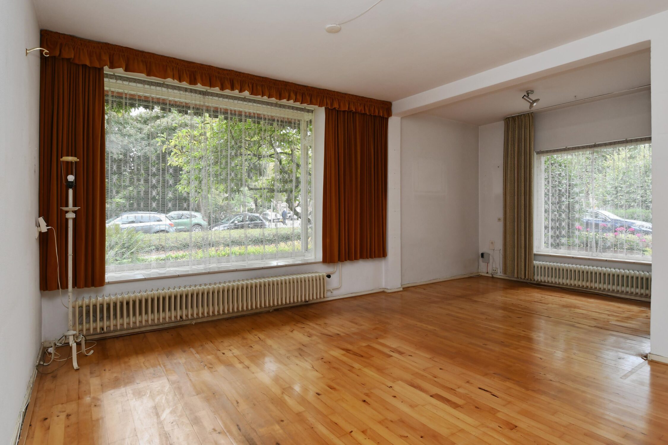 L-vormige woonkamer van circa 38 m2 met een deur naar de tuin. De kamer is afgewerkt met een houten vloer.