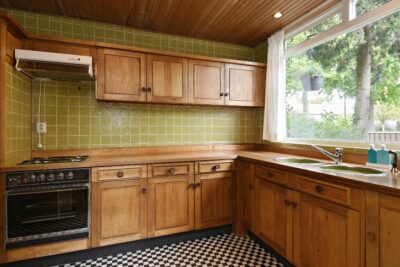 Aparte keuken met een keukenmeubel in hoekopstelling, inbouwkast en deur naar de tuin. De keuken is uitgerust met een dubbele spoelbak, 4-pits gaskookplaat, oven en koelkast.