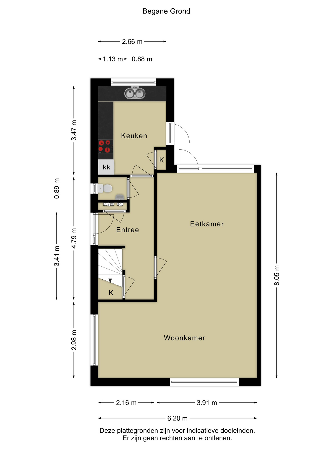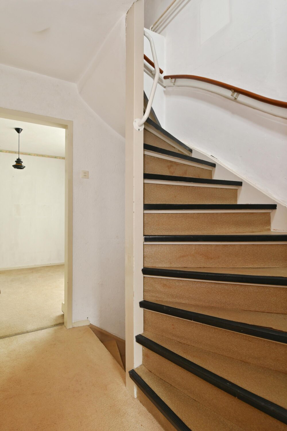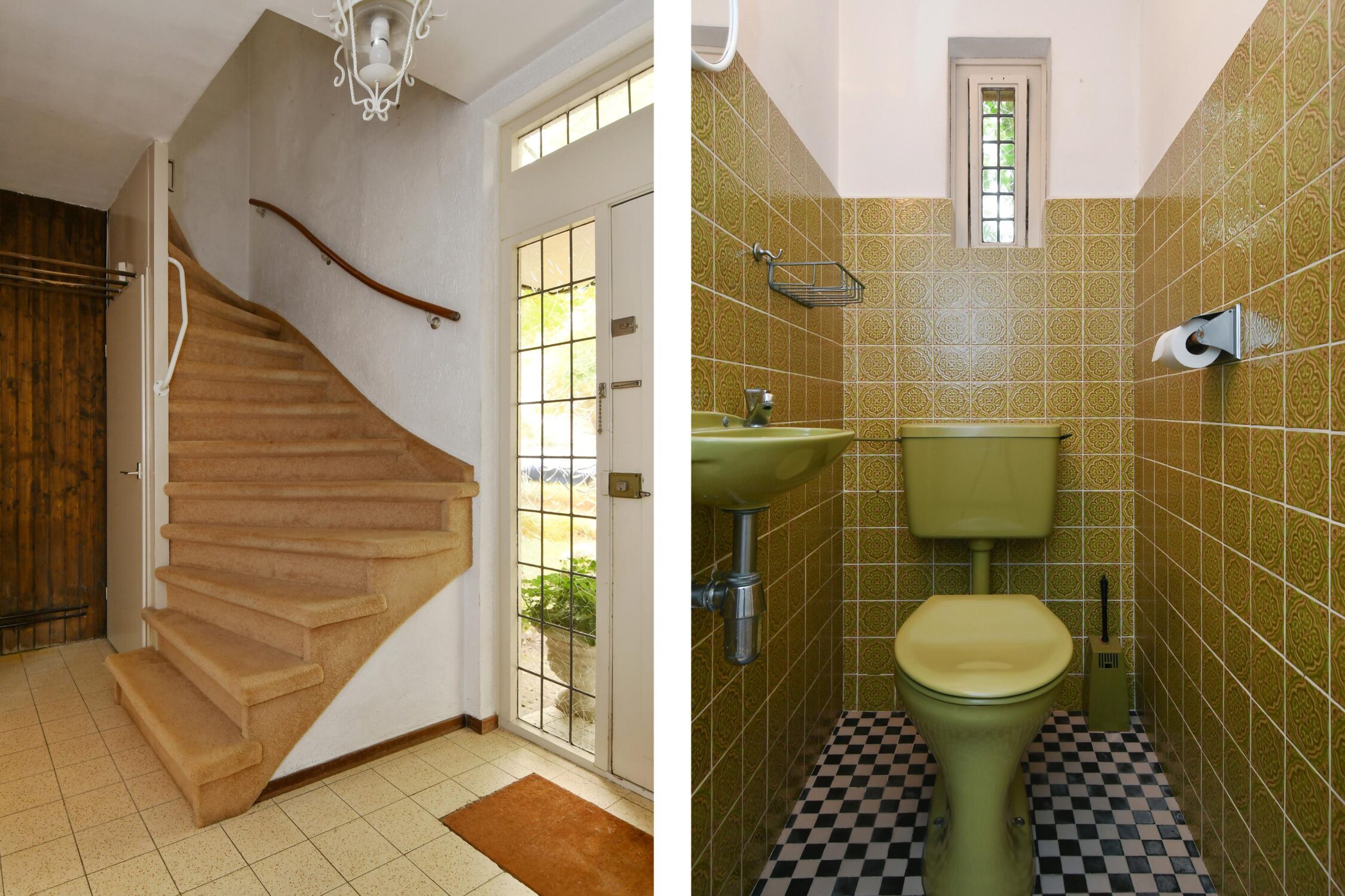 Entree/hal met de meterkast, het toilet, trapkast, trapopgang en toegang tot de keuken en woonkamer. Deels betegeld toilet met een staand closet en fonteintje.