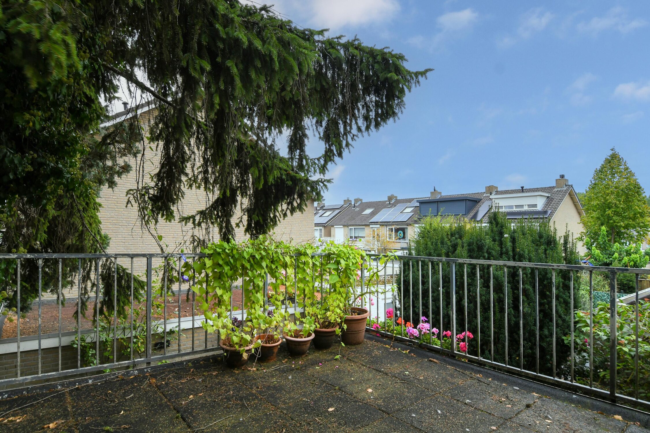 Deels betegelde badkamer met een ligbad, staand closet, wastafel en deur naar een dakterras. Dakterras met uitzicht op de achtertuin.