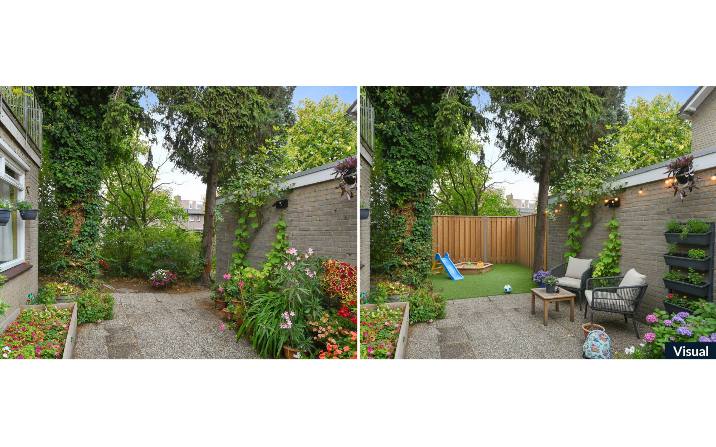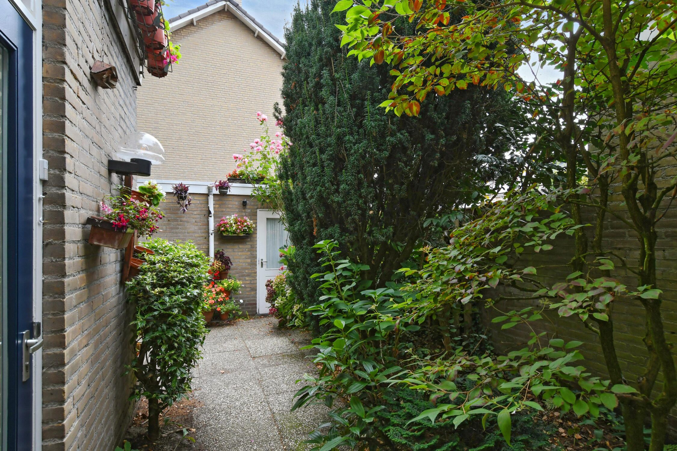 Achtertuin gelegen op het westen met bestrating, borders, beplanting, garage (v.v. elektra) en eigen achterom.