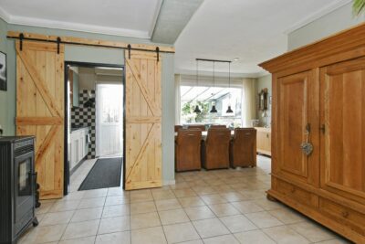 U-vormige woonkamer van circa 35 m2 met een apart zit- en eetgedeelte en een houten palletkachel (ter overname). De woonkamer is afgewerkt met een tegelvloer die doorloopt over de begane grond. Vanuit de woonkamer toegang tot de badkamer.