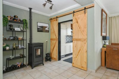 – Ruime woonkamer met een sfeervolle palletkachel die ter overname is;