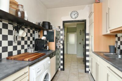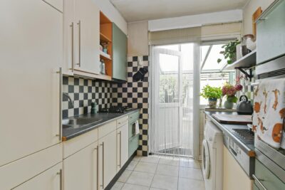 Aparte keuken met een keukenmeubel aan beide zijden en deur naar de tuin. De keuken is uitgerust met een 5-pits kookplaat, afzuigkap, vaatwasser, combioven, koelkast, diepvries, aansluitingen voor de wasmachine en 1,5 spoelbak.