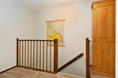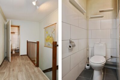 Overloop met aansluitend een toiletruimte, een slaapkamer en bergruimte. De toiletruimte is voorzien van een staand closet, wastafel en de cv-installatie.