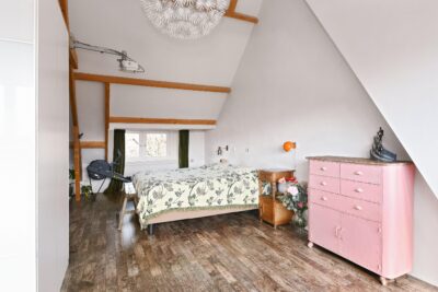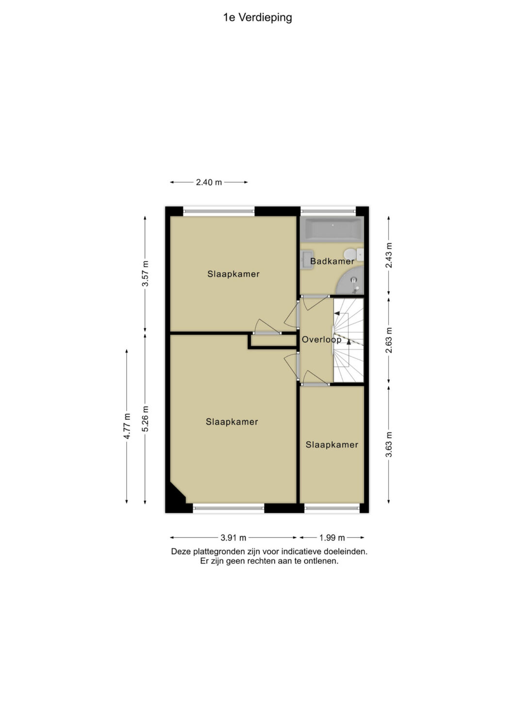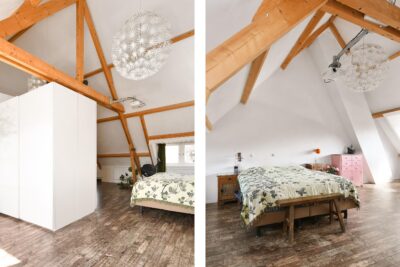 Aan de voorzijde bevinden zich twee slaapkamers. Aan de achterzijde één slaapkamer en de badkamer. De kamers zijn respectievelijk 20 m², 7 m² en 14 m² groot.