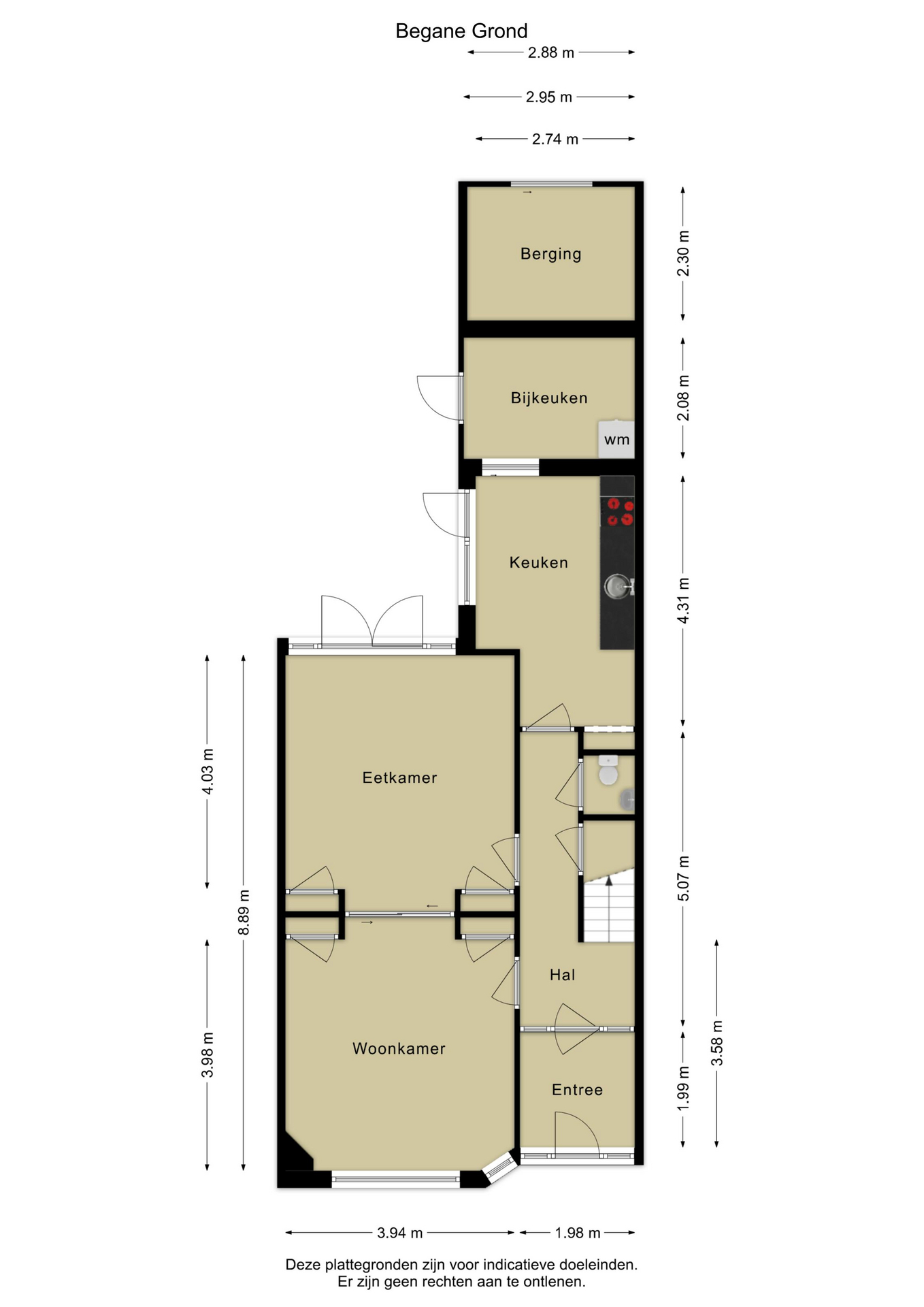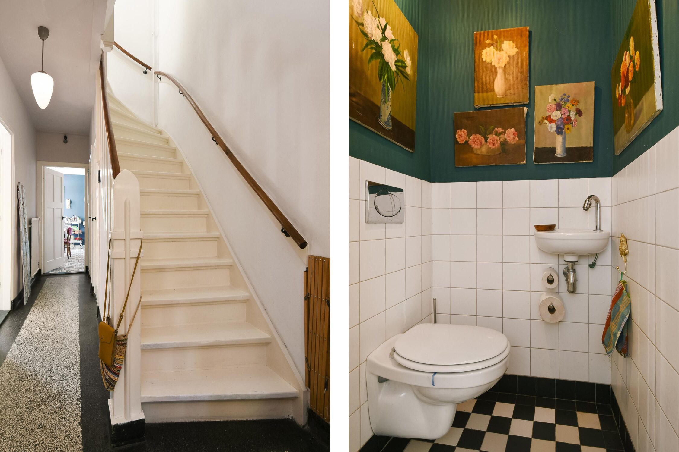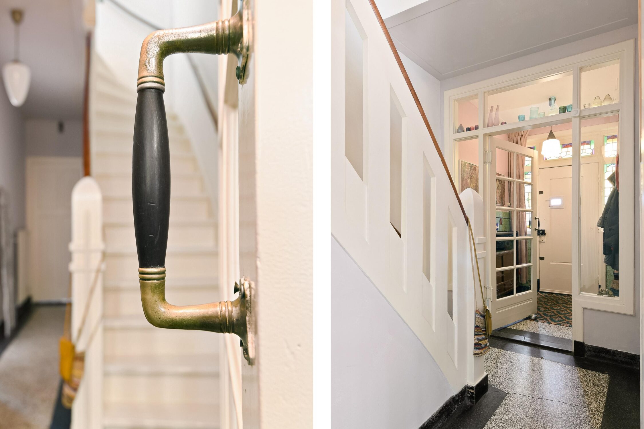Vestibule met originele glas-in-loodramen en wandbetegeling. Aansluitend de hal met het deels betegelde toilet met een inbouwcloset en fonteintje, een trapkast, trapopgang en toegang tot de woonkamer en keuken. De hal is voorzien van de authentieke terrazzovloer die doorloopt in de vestibule.