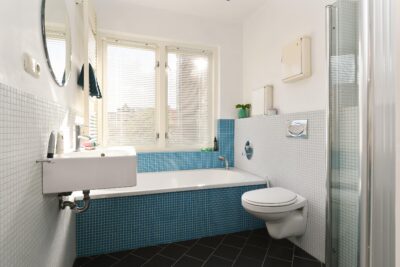 Deels betegelde badkamer met een wastafel, inbouwcloset, ligbad en douche.