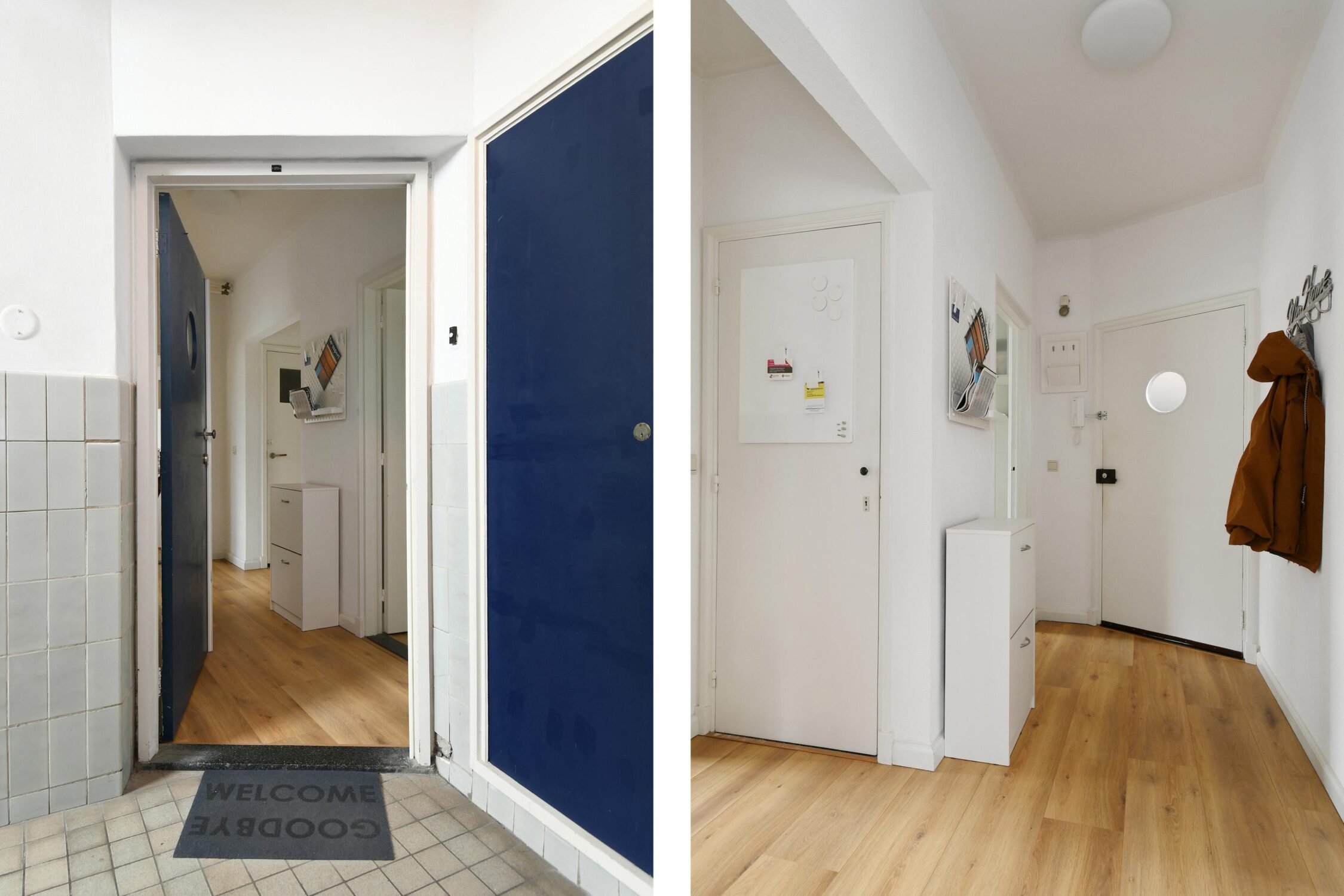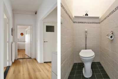 Entree/hal met een vaste kast en een gedeeltelijk betegelde toiletruimte met een closet. De hal is afgewerkt met een laminaatvloer die doorloopt in de woon-/eetkamer en slaapkamers.