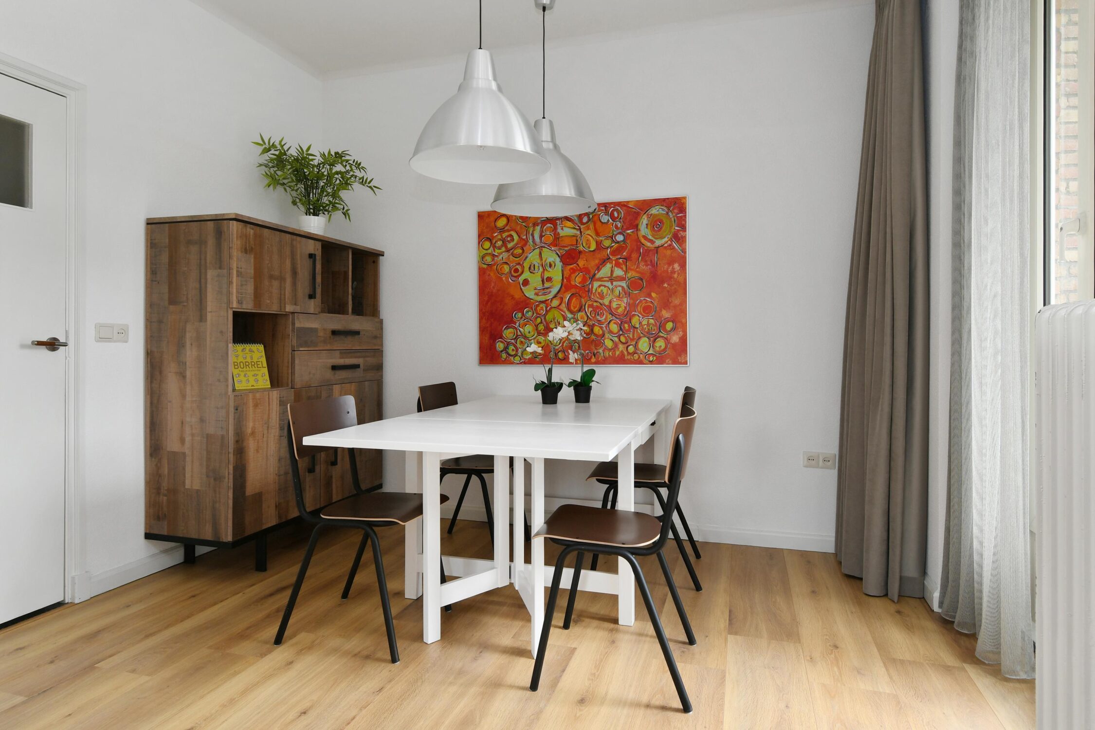 Woonkamer met een eetkamer en-suite met toegang tot het balkon aan de voorzijde. Door de hoekligging heeft het appartement een extra zijraam in de woonkamer.
