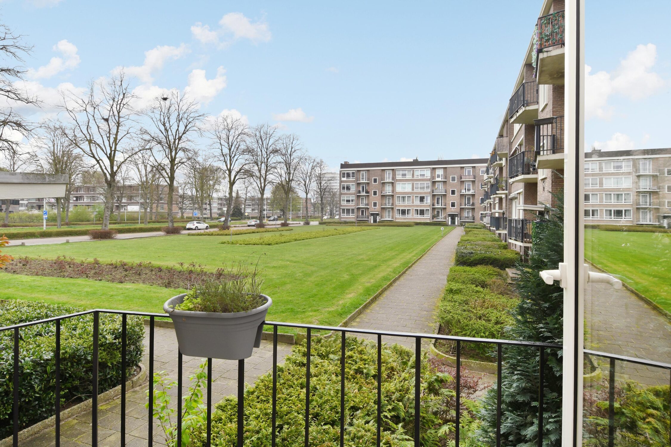Balkon 1, gelegen op het noordoosten, met uitzicht op een gemeenschappelijke groenvoorziening.