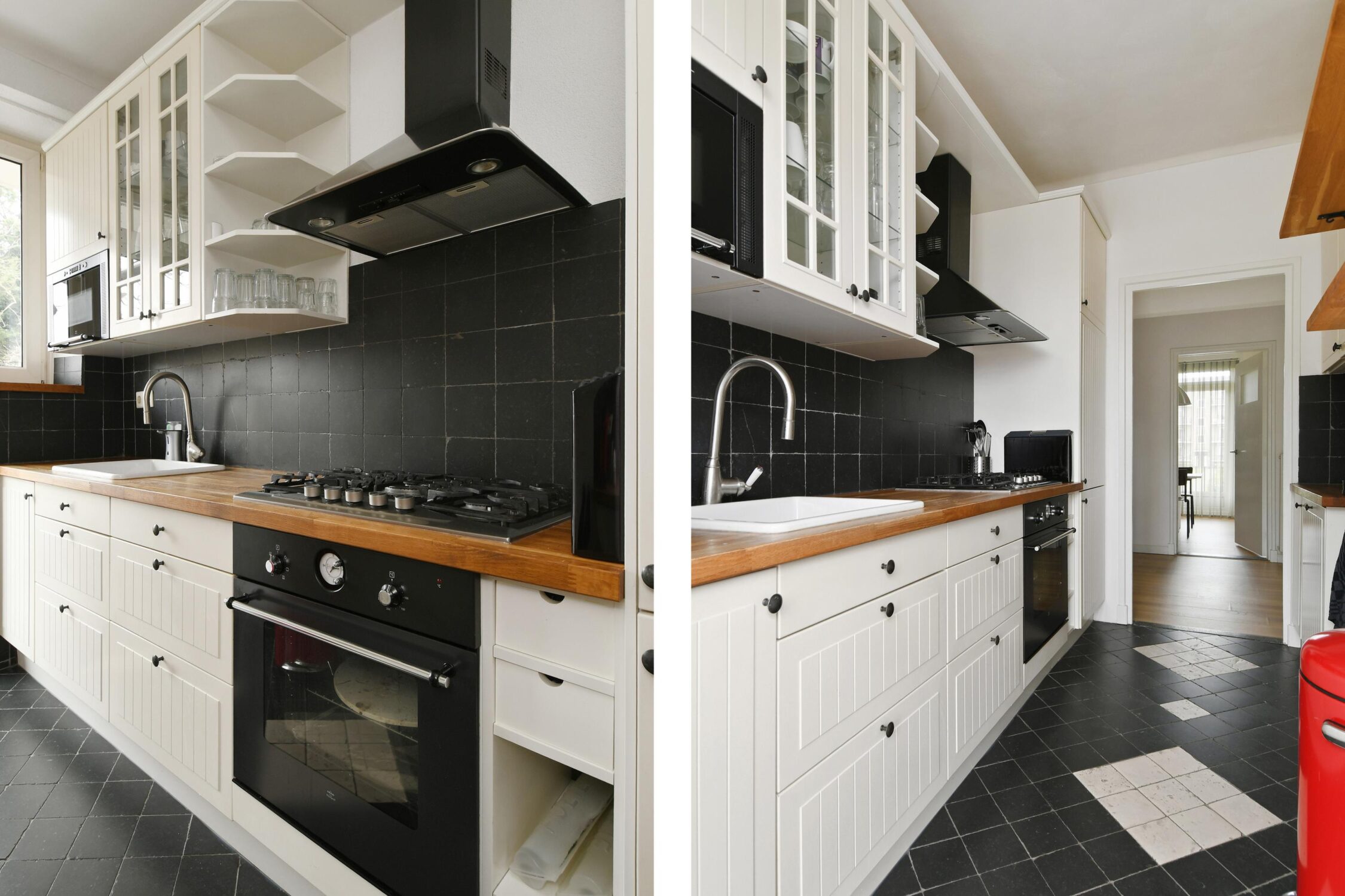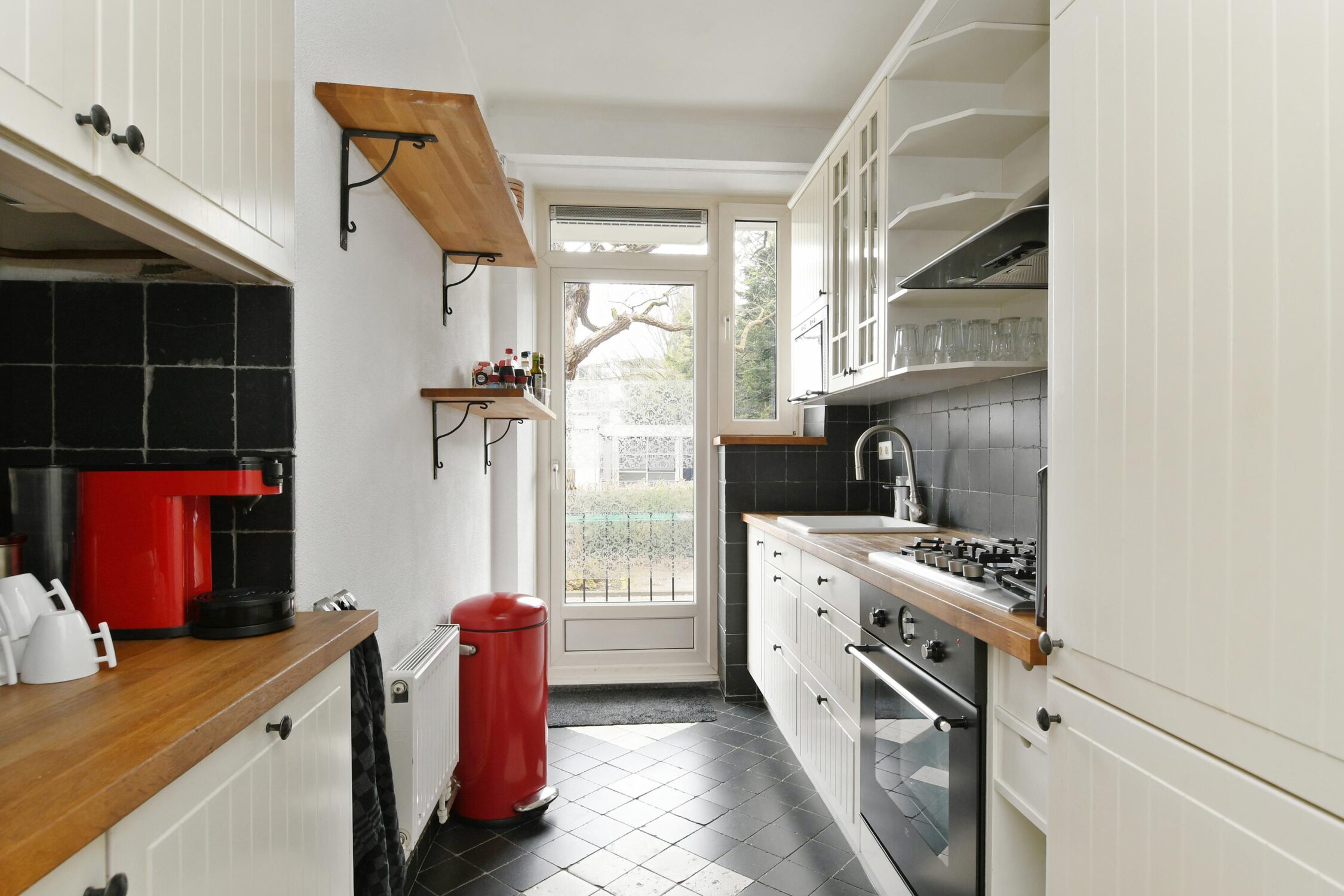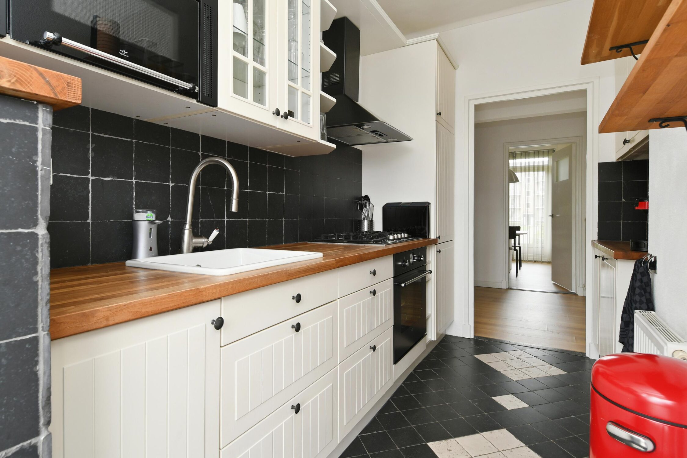 Afzonderlijke keuken met een keukenmeubel met een vaatwasser, oven, magnetron, koel-/vries combinatie, 5-pits gaskookplaat en opstelling cv-ketel. Toegang tot het balkon aan de achterzijde.