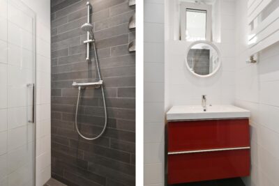 De badkamer is deels betegeld en v.v. een douche en vaste wastafel in meubel.
