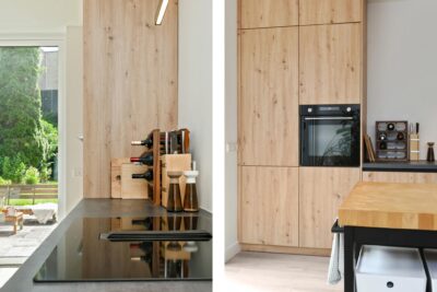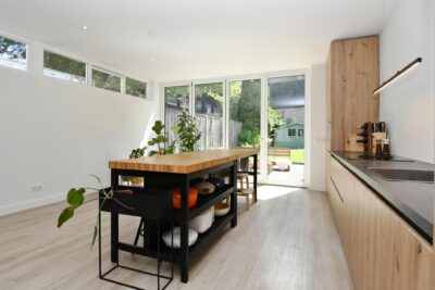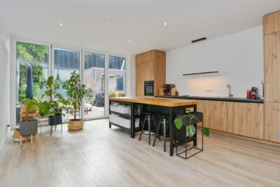 Aan de tuinzijde een open keuken met een keukeneiland en keukenmeubel in wandopstelling. De keuken is uitgerust met inductiekookplaat met geïntegreerde afzuiging, combioven, koelkast en vaatwasser. De harmonicapui aan de achterzijde kan geheel worden geopend.