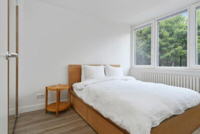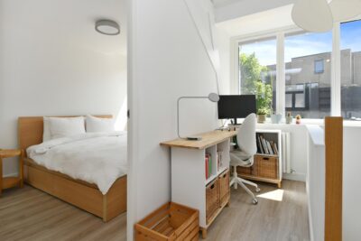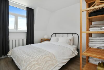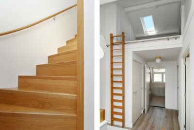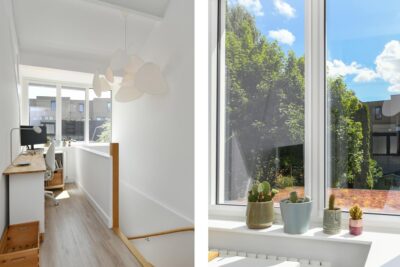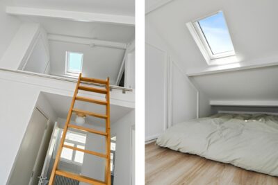 – De 1ste verdieping is ingedeeld met 2 slaapkamers, werkhoek, badkamer en open berg-/slaapvide;