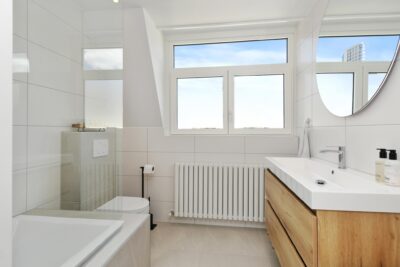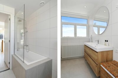 Geheel betegelde badkamer met een ligbad met douchewand, vaste wastafel in meubel, inbouwcloset en dakkapel.
