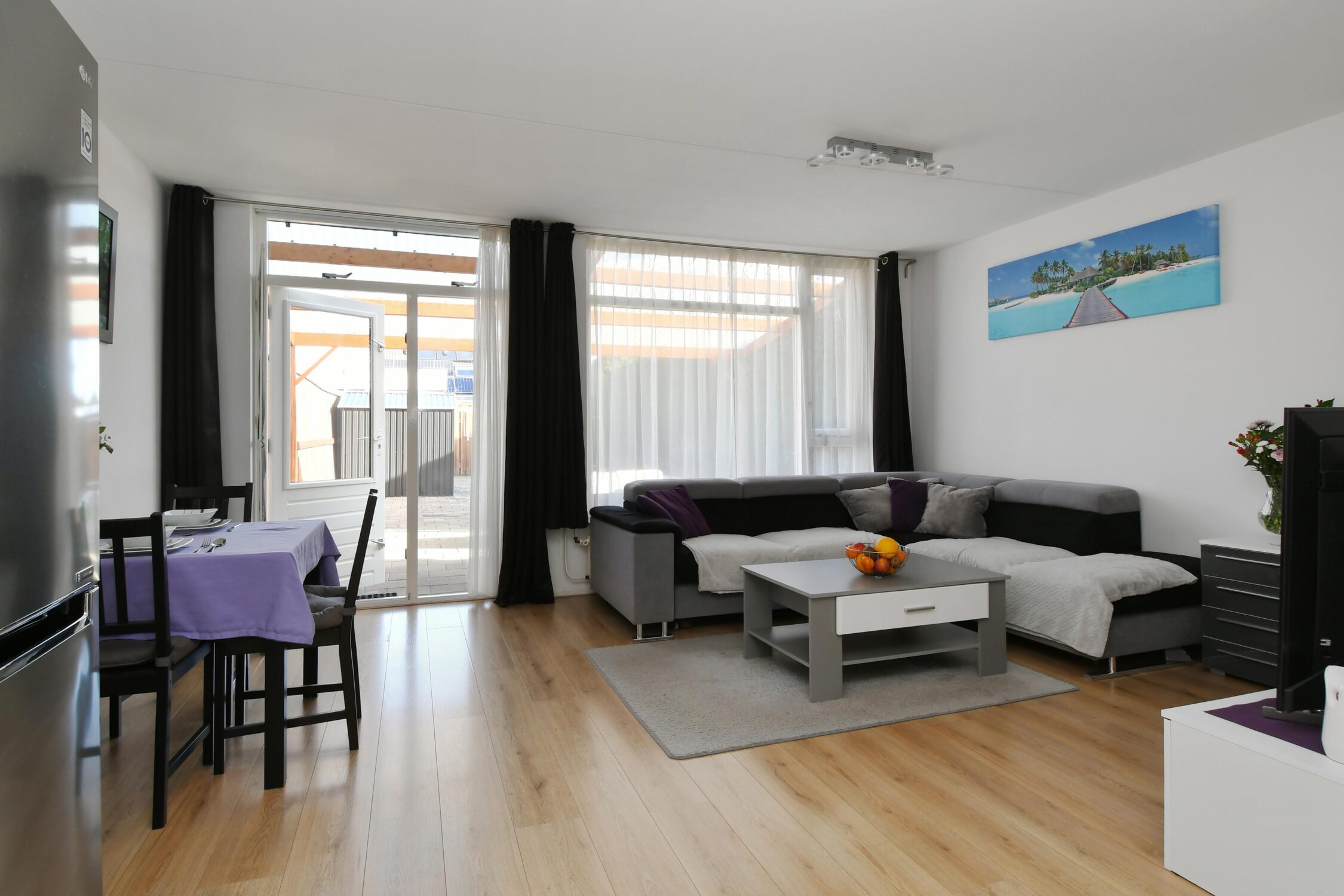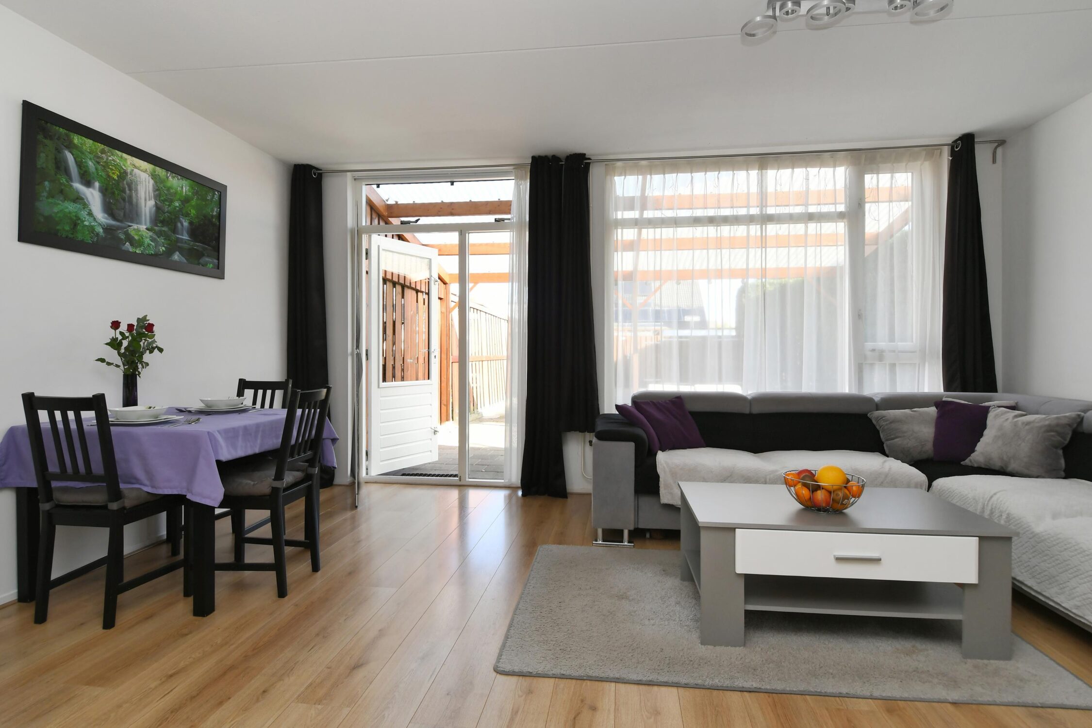 – Tuingerichte woonkamer met een open keuken;