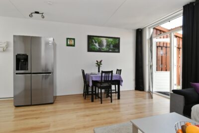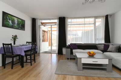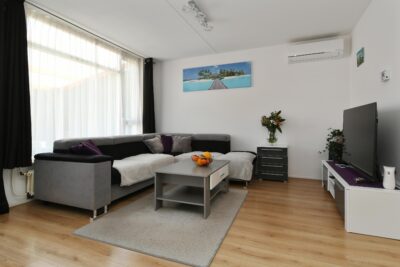 Tuingerichte woonkamer, aan de achterzijde van het huis, van circa 24 m2 met een trapkast, airco (2021) en deur naar de tuin.