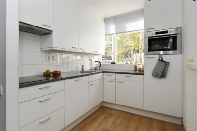 Open keuken aan de voorzijde van de woning met een keukenmeubel in hoekopstelling. De keuken is uitgerust met een 4-pits inductiekookplaat (2 fasen, ca. 2022), afzuigkap, vaatwasser (2023), 1,5 spoelbak, combi oven en losse Amerikaanse koelkast.
