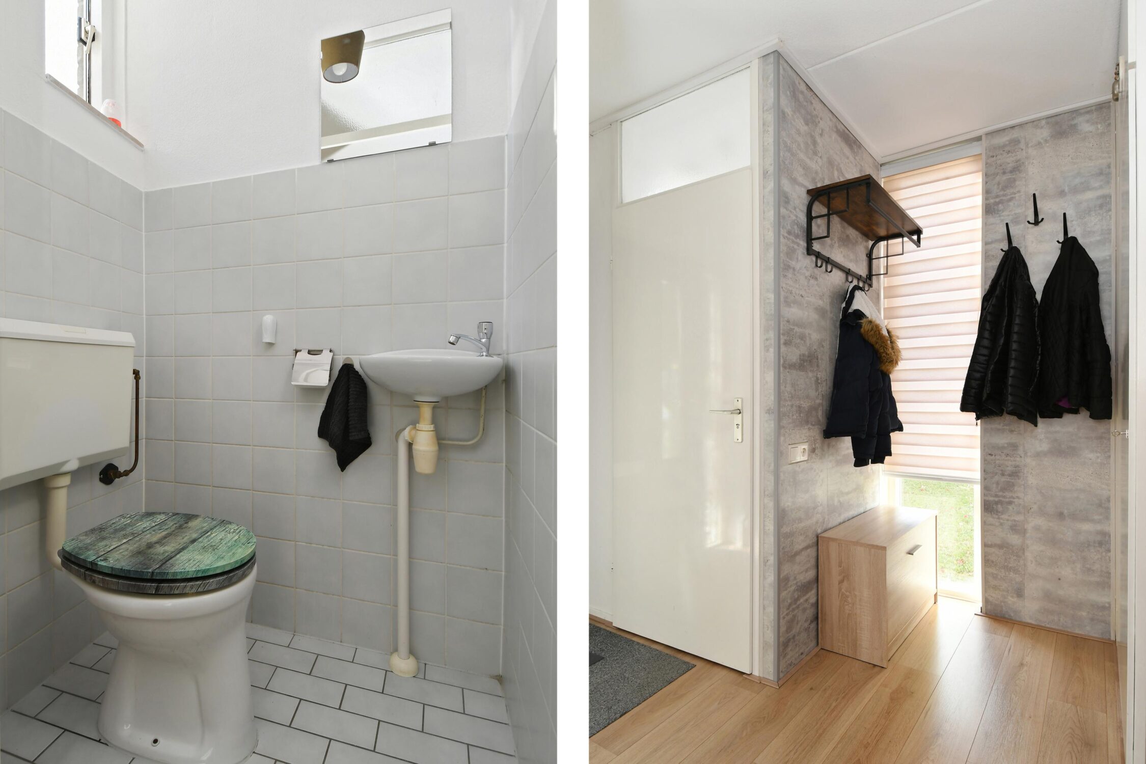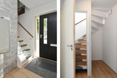 Entree/hal met de meterkast, het toilet, de trapopgang en toegang tot de woonkamer. De hal is afgewerkt met een laminaatvloer die doorloopt in de woonkamer en keuken.