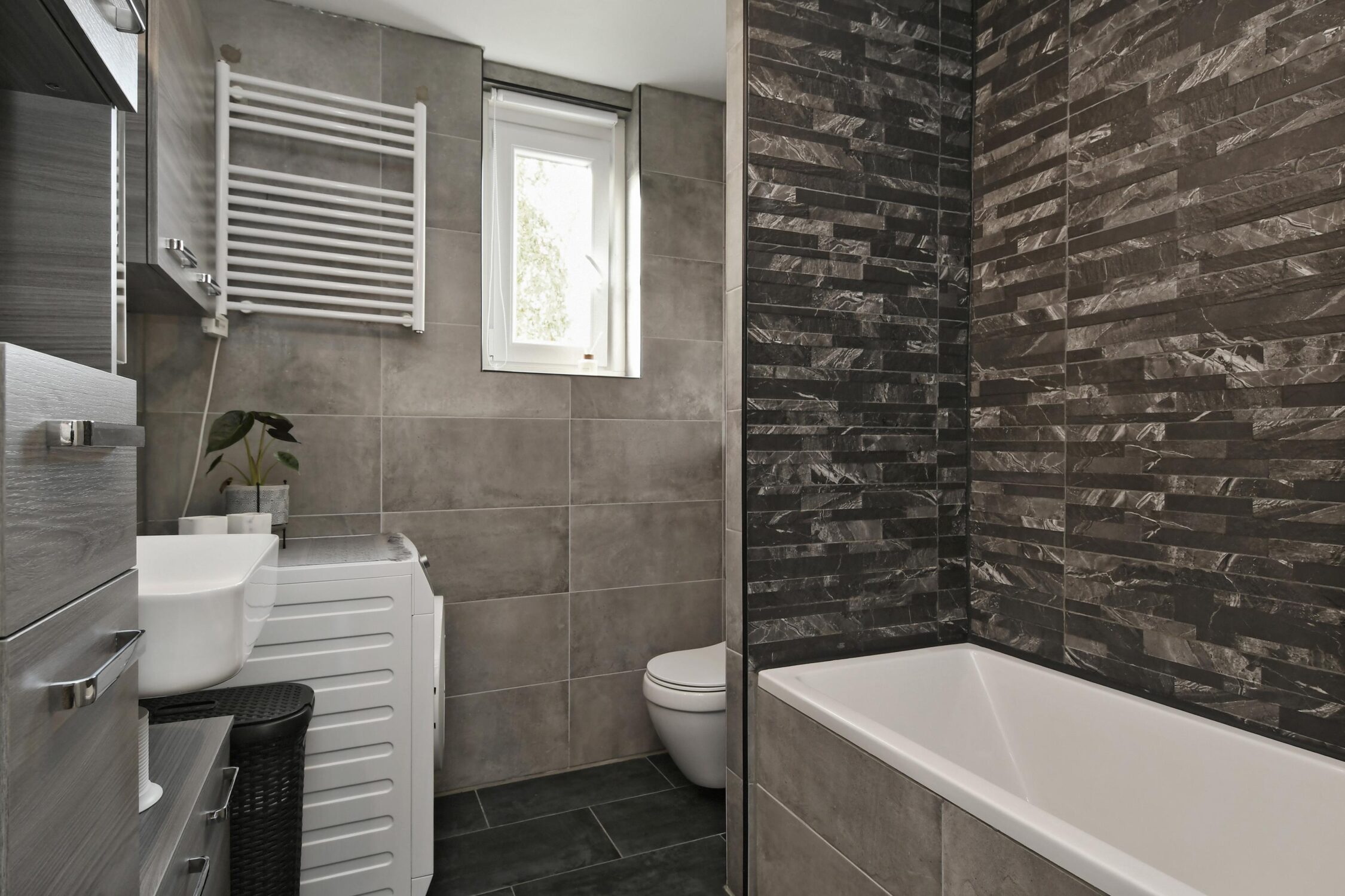 Geheel betegelde badkamer (ca. 2022) met een inbouwcloset, ligbad met douchemogelijkheid, wastafel in meubel, elektrische verwarming en de aansluiting voor de wasmachine.