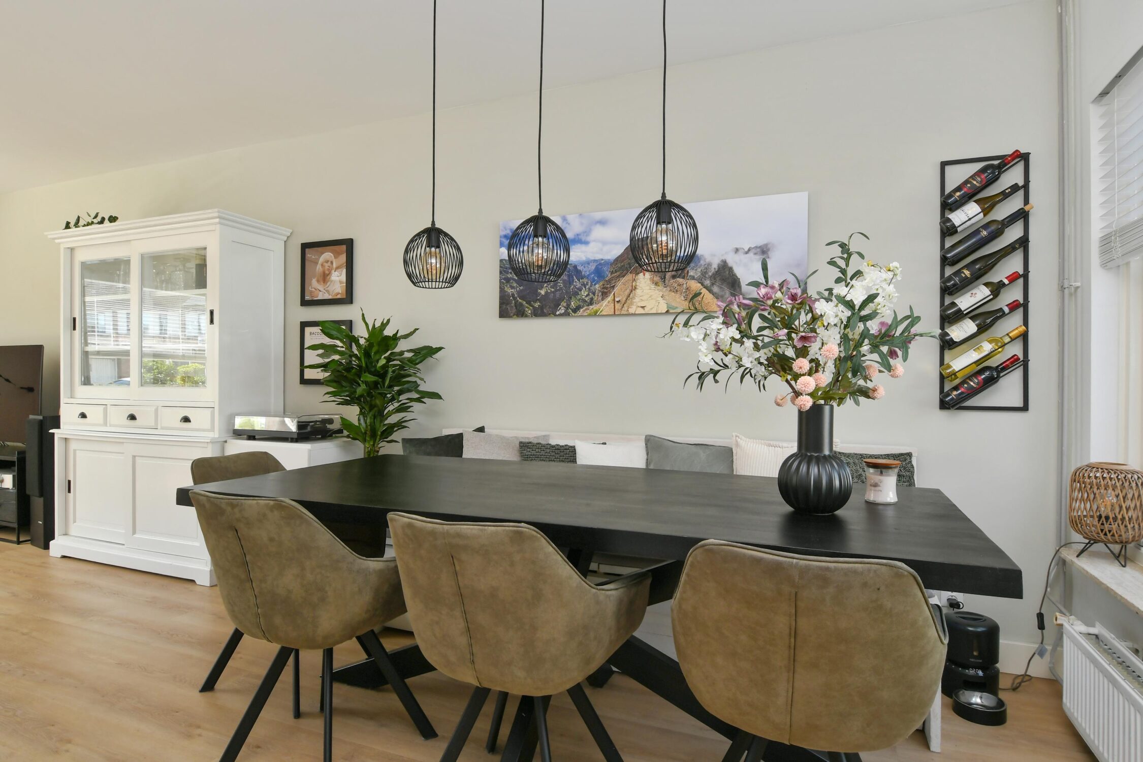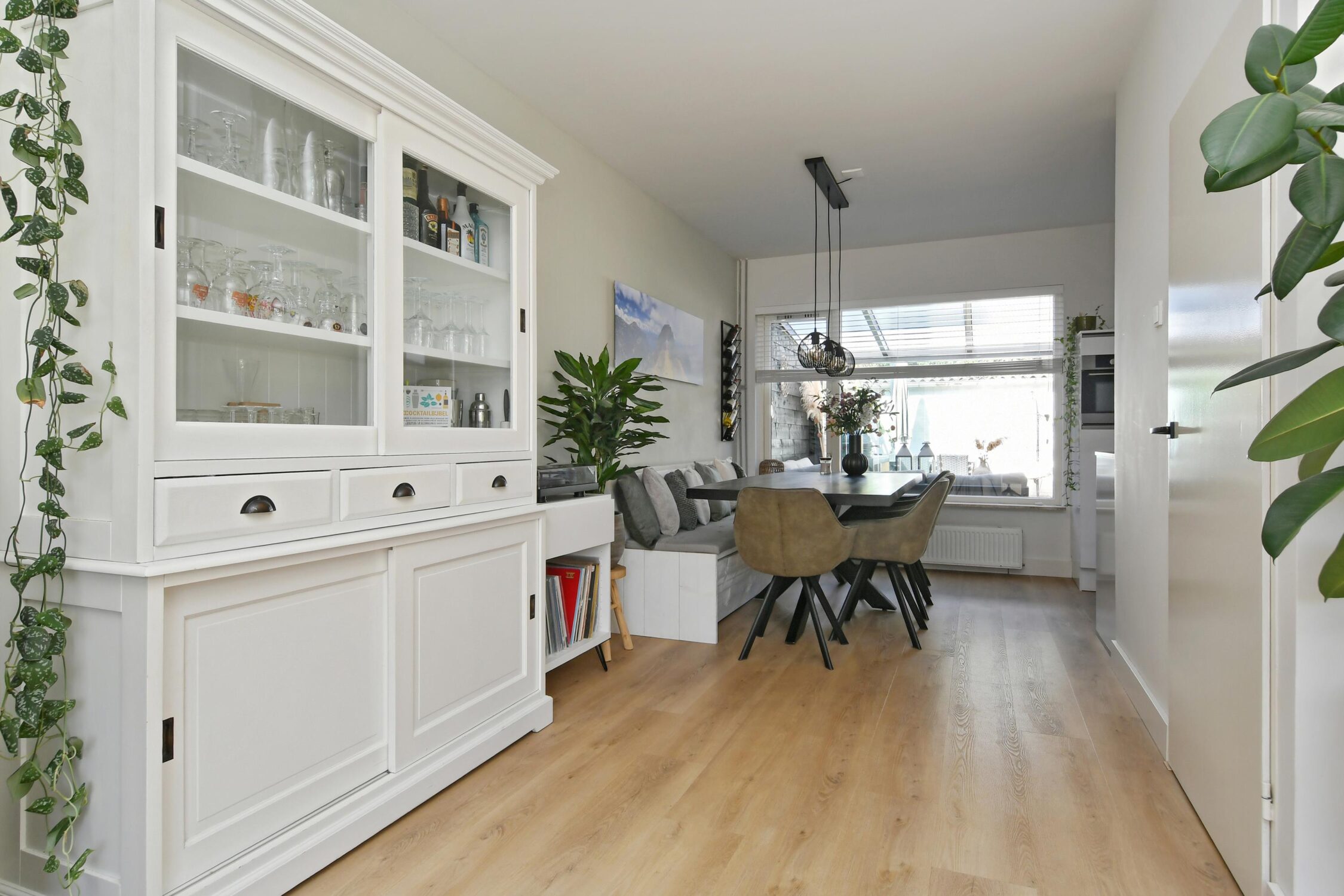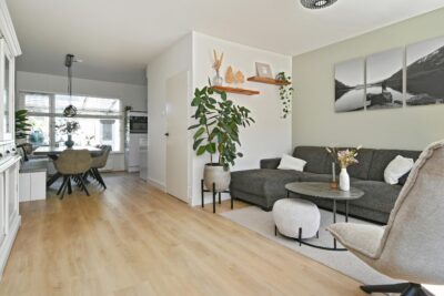 L-vormige woonkamer van circa 27 m2 met aansluitend een open keuken en hal. De kamer is afgewerkt met een pvc-vloer die doorloopt over de begane grond.