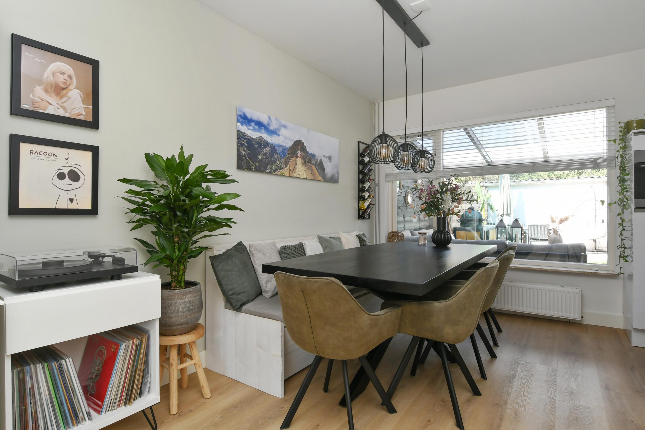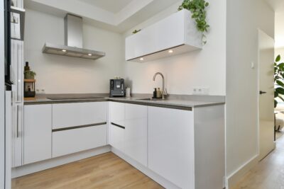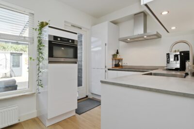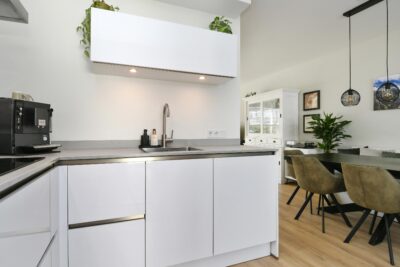 Open keuken (2022) met een keukenmeubel in hoekopstelling en deur naar de tuin. De keuken is uitgerust met een diepvries, koelkast, 4-zone inductiekookplaat, afzuigkap, vaatwasser en combioven.