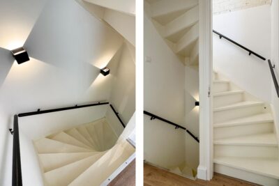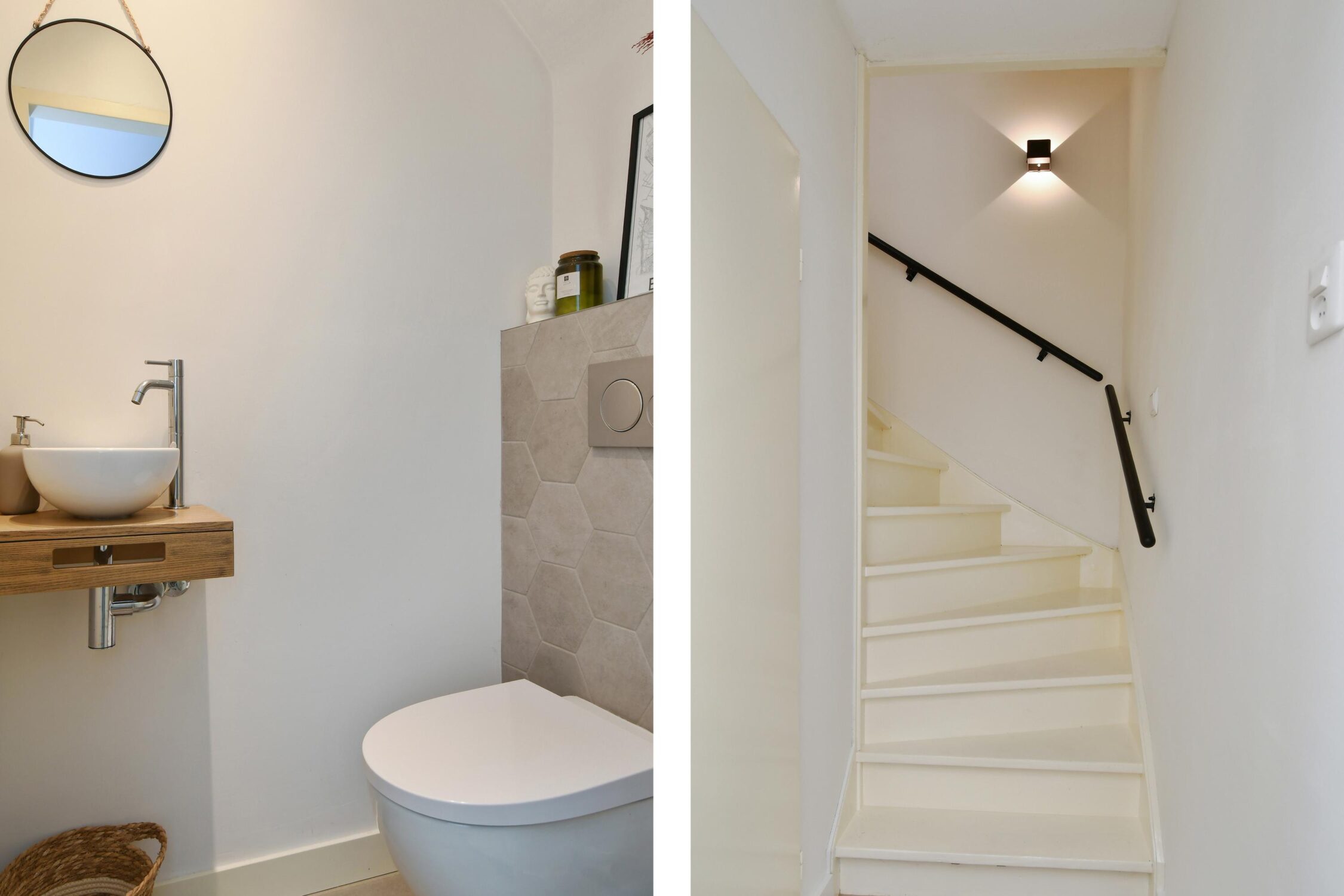 Portaal met het toilet en trapopgang naar de verdieping. In 2022 vernieuwd toilet met een inbouwcloset en fonteintje.