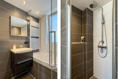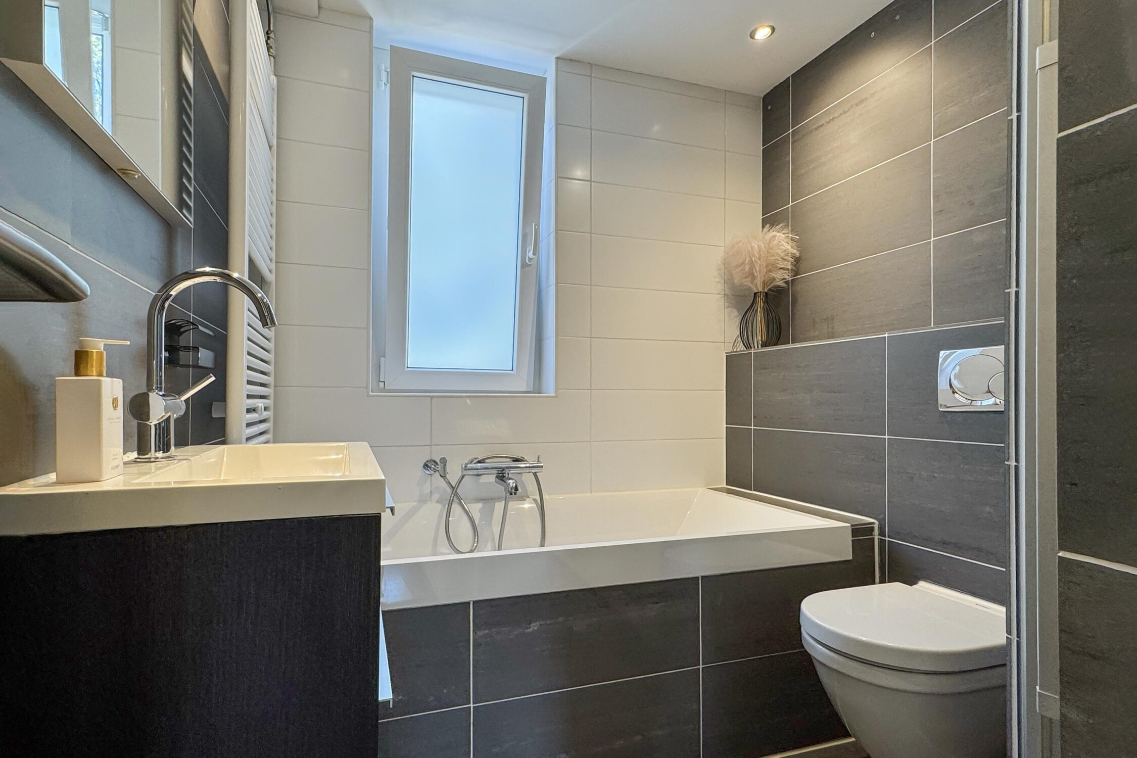 Geheel betegelde badkamer met een ligbad, inbouwcloset, douche, wastafel in meubel en designradiator.