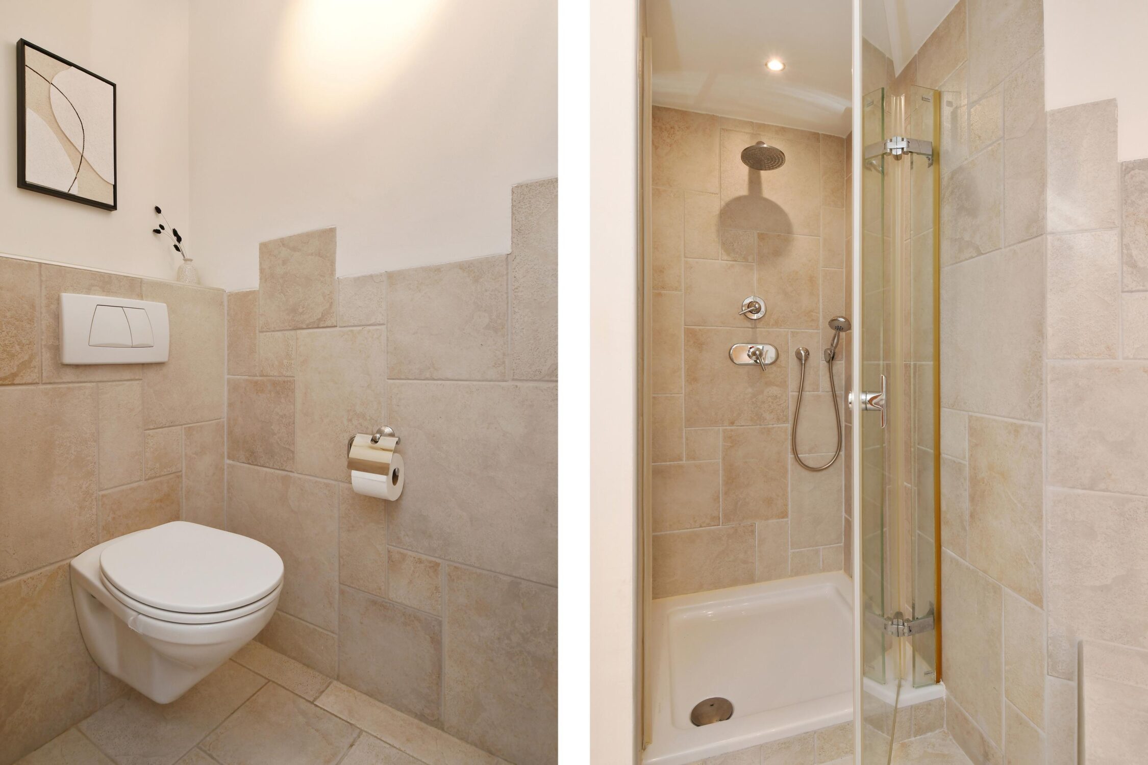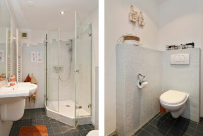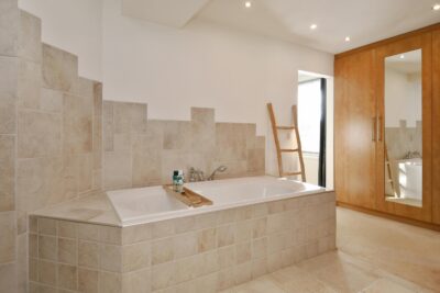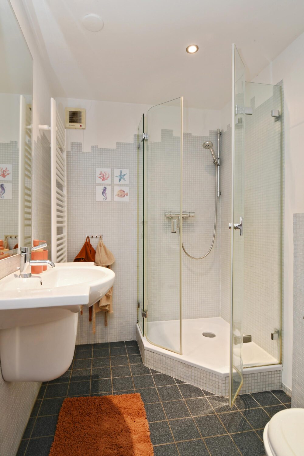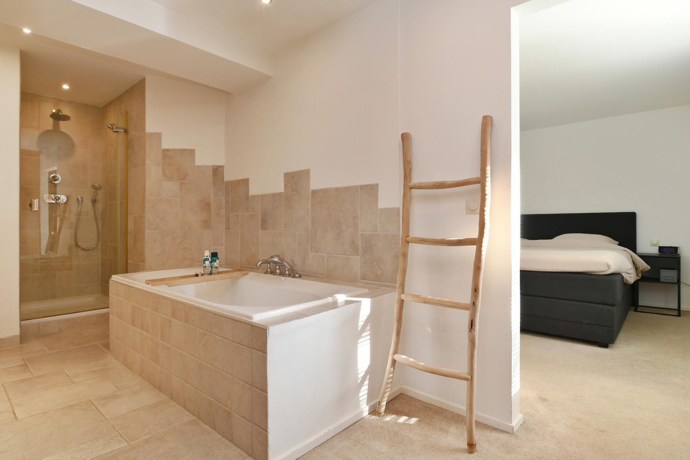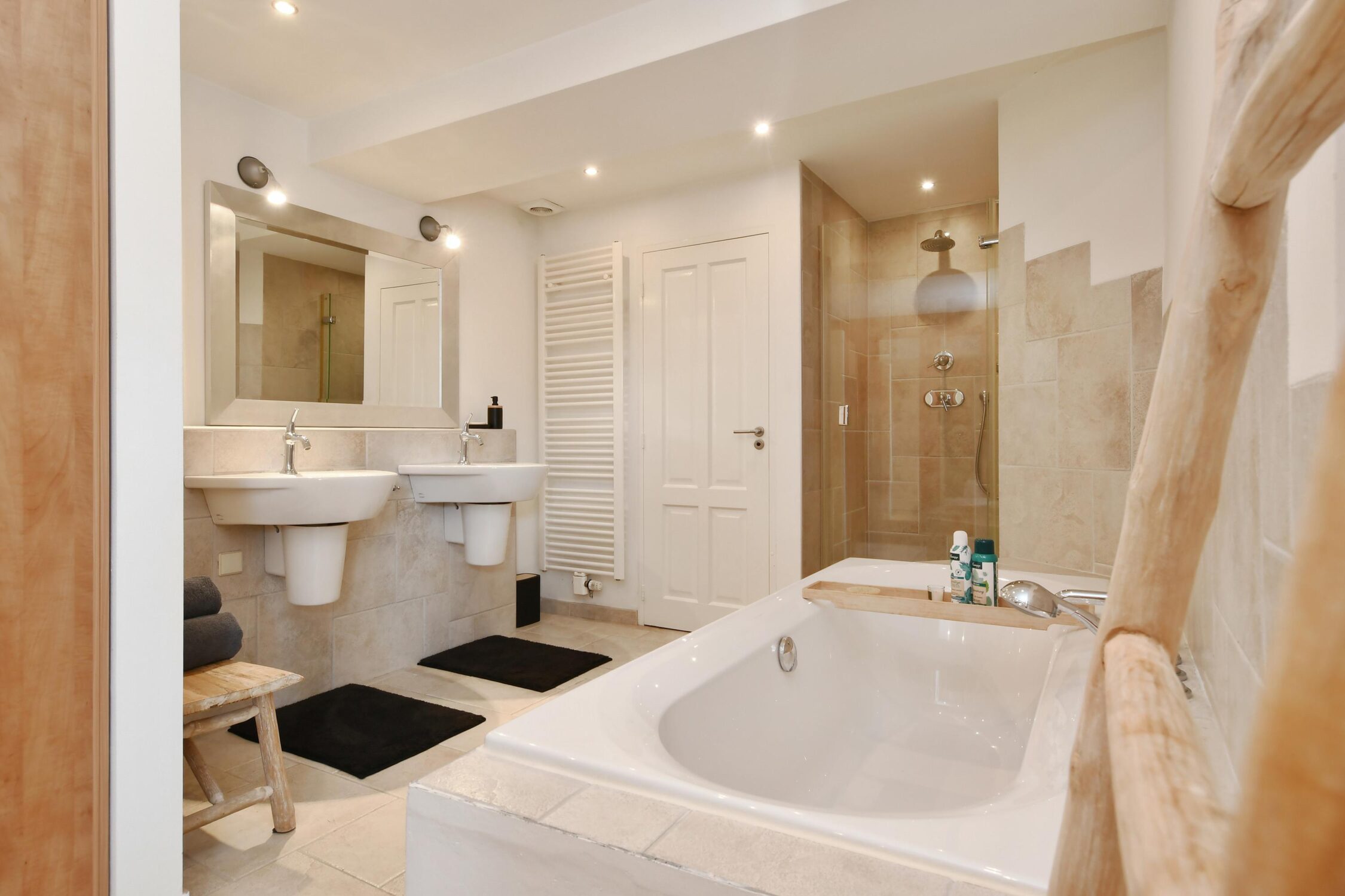 De badkamer en-suite beschikt over een ligbad, inloopdouche, dubbele wastafel en apart toilet. De 2de badkamer is voorzien van een douchecabine, wastafel en inbouwcloset. Een afgesloten trapopgang geeft toegang tot de 2de verdieping.