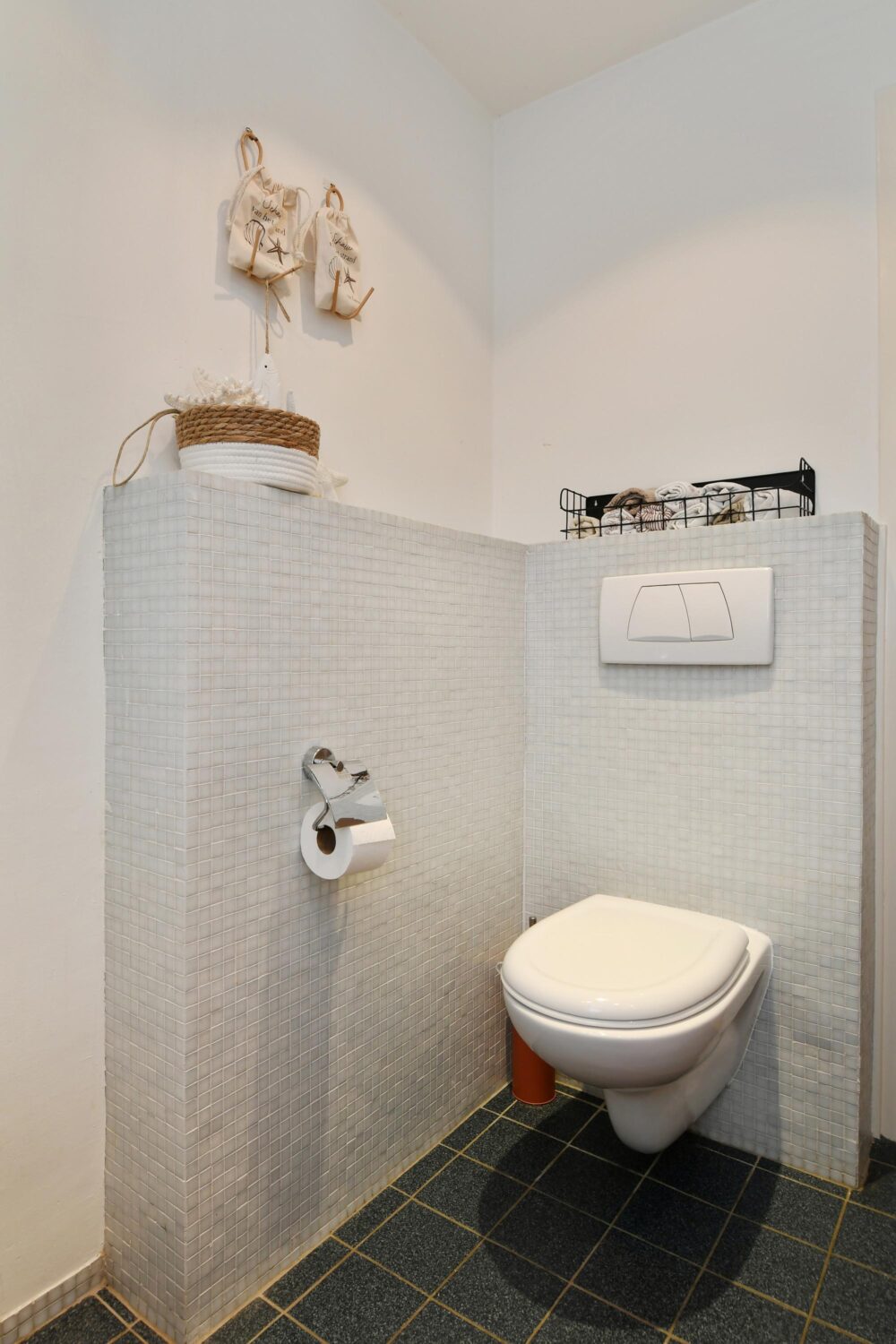Aan de voorzijde van de woning bevindt zich de aparte woonkeuken. De keuken is voorzien van diverse inbouwapparatuur en veel berg- en werkruimte. Aansluitend de bijkeuken met een ruimte voor witgoed, de badkamer (voorzien van douche, wastafel en toilet) en toegang tot de living, achtertuin en slaap-werkkamer.