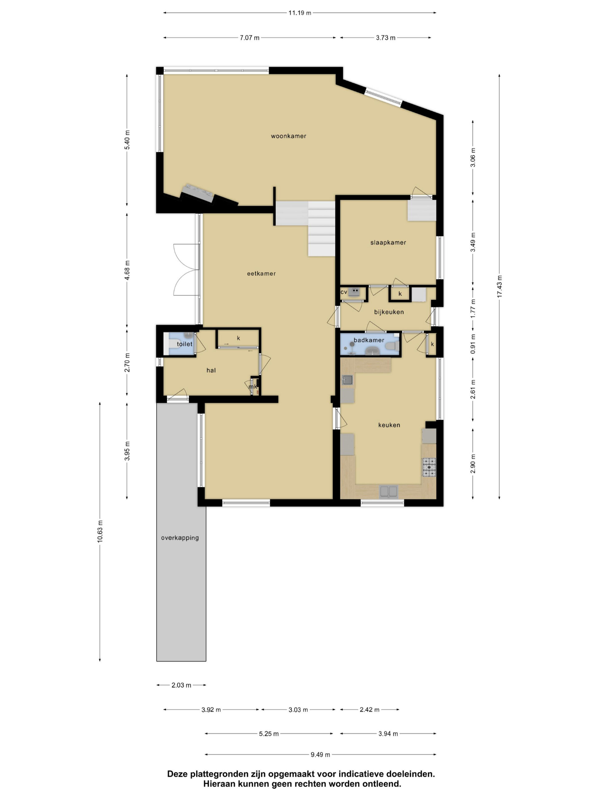 Middels een overdekte entree toegang tot de woning. De hal met toilet en garderobe geeft toegang tot de grote open woonruimte, welke is onderverdeeld is in 3 gedeelten. Aan de rechterhand een ruimte met toegang tot de keuken en tuin aan de voorzijde. Deze ruimte is af te sluiten middels een schuifdeur en daarmee een ideale ruimte voor een eet-, speel- of werkkamer.