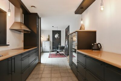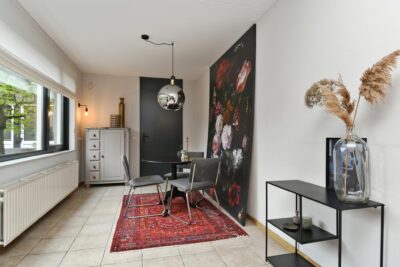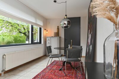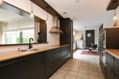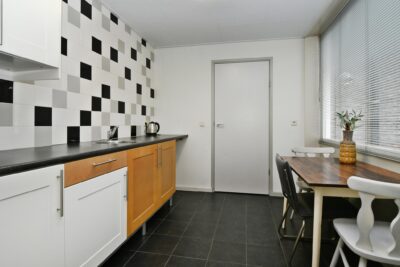 Half open woonkeuken met een keukenmeubel aan 2 zijden, deur naar de tuin en toegang tot de bijkeuken. De keuken is uitgerust met een inductiekookplaat, oven, magnetron, afzuigkap, vaatwasser en koel-/vriescombinatie. De keuken is afgewerkt met een tegelvloer die doorloopt in de bijkeuken en hal.