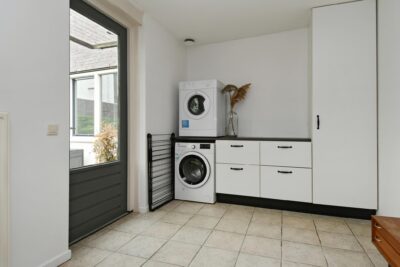Bijkeuken met de aansluitingen voor de wasmachine en droger, een kastenmeubel en deur naar de tuin.