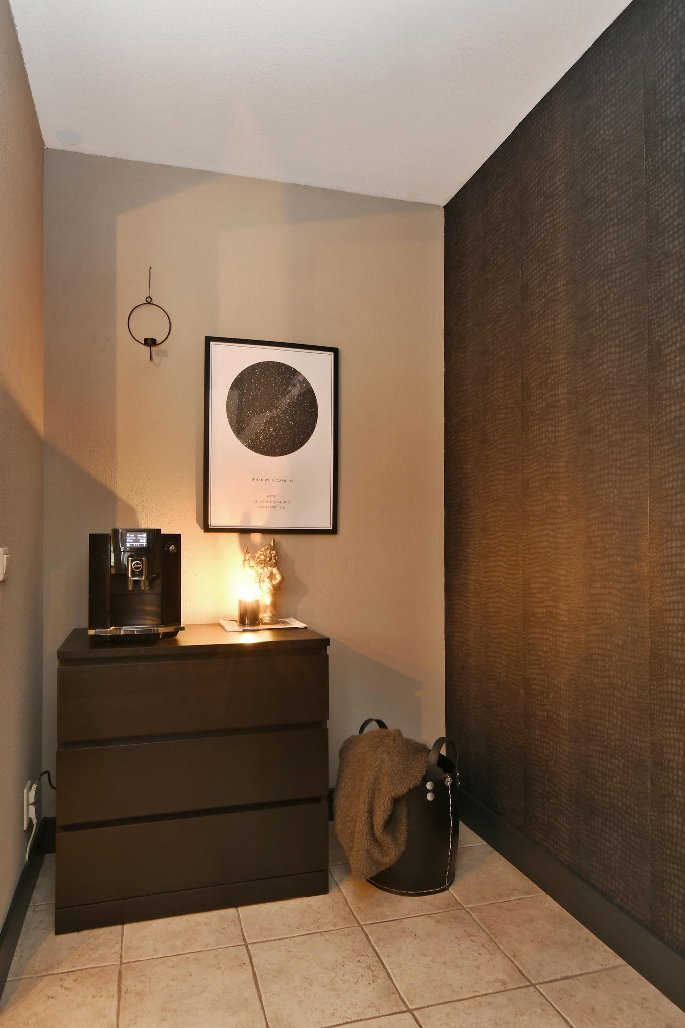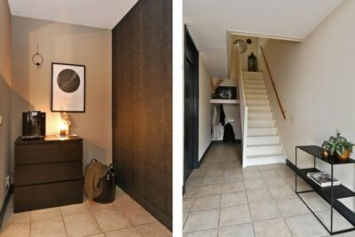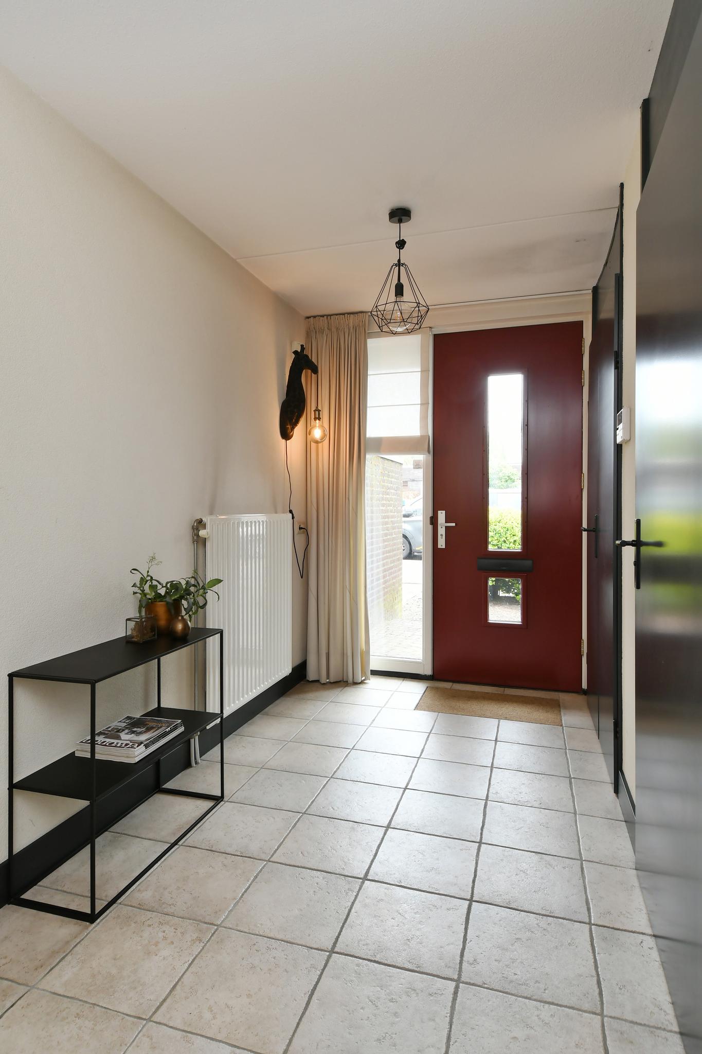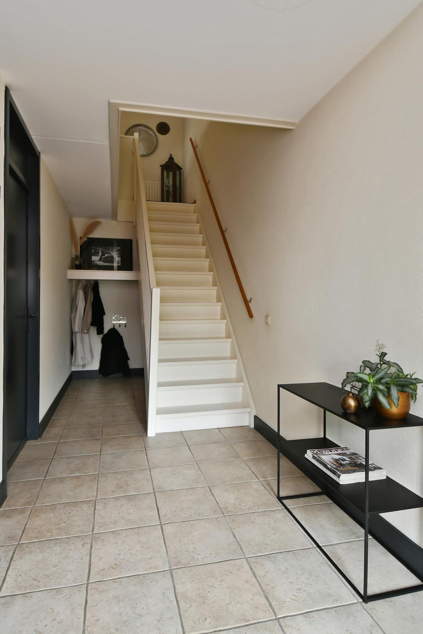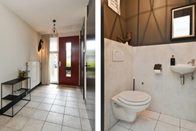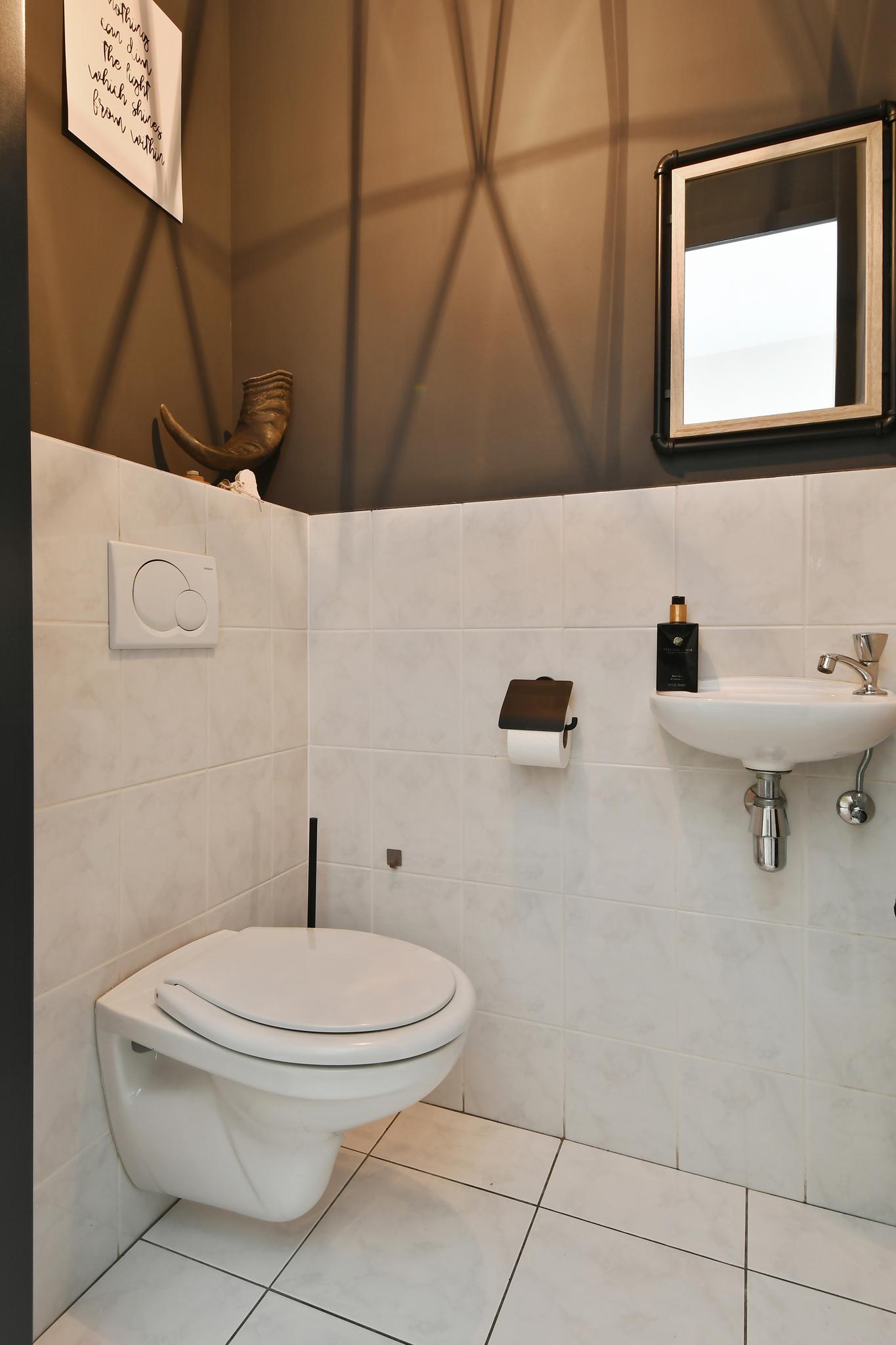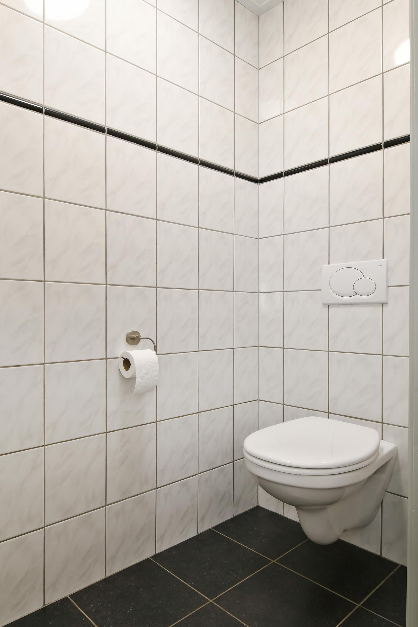 Entree/hal met de meterkast, het toilet, trapopgang en toegang tot de woonkamer. Deels betegeld toilet met een inbouwcloset en fonteintje.