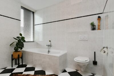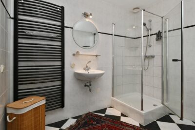 Geheel betegelde badkamer met een douche, wastafel, ligbad en inbouwcloset.