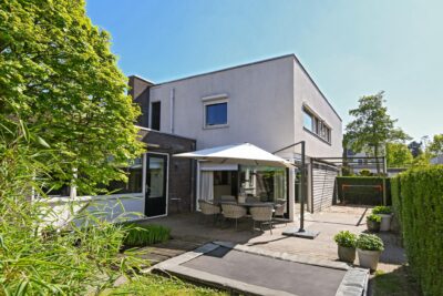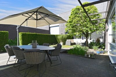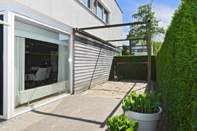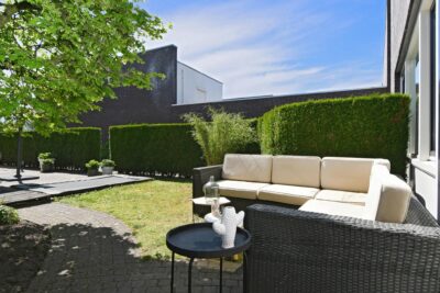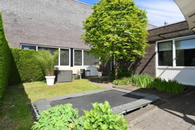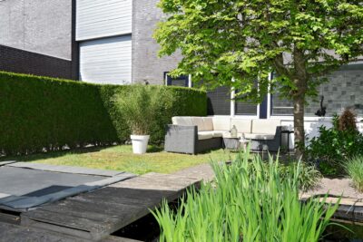 Achtertuin van circa 95 m2 gelegen op het noordoosten met 2 terrassen, bestrating, gazon, borders met beplanting en buitenkraantje.
