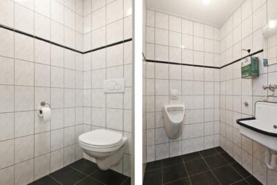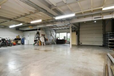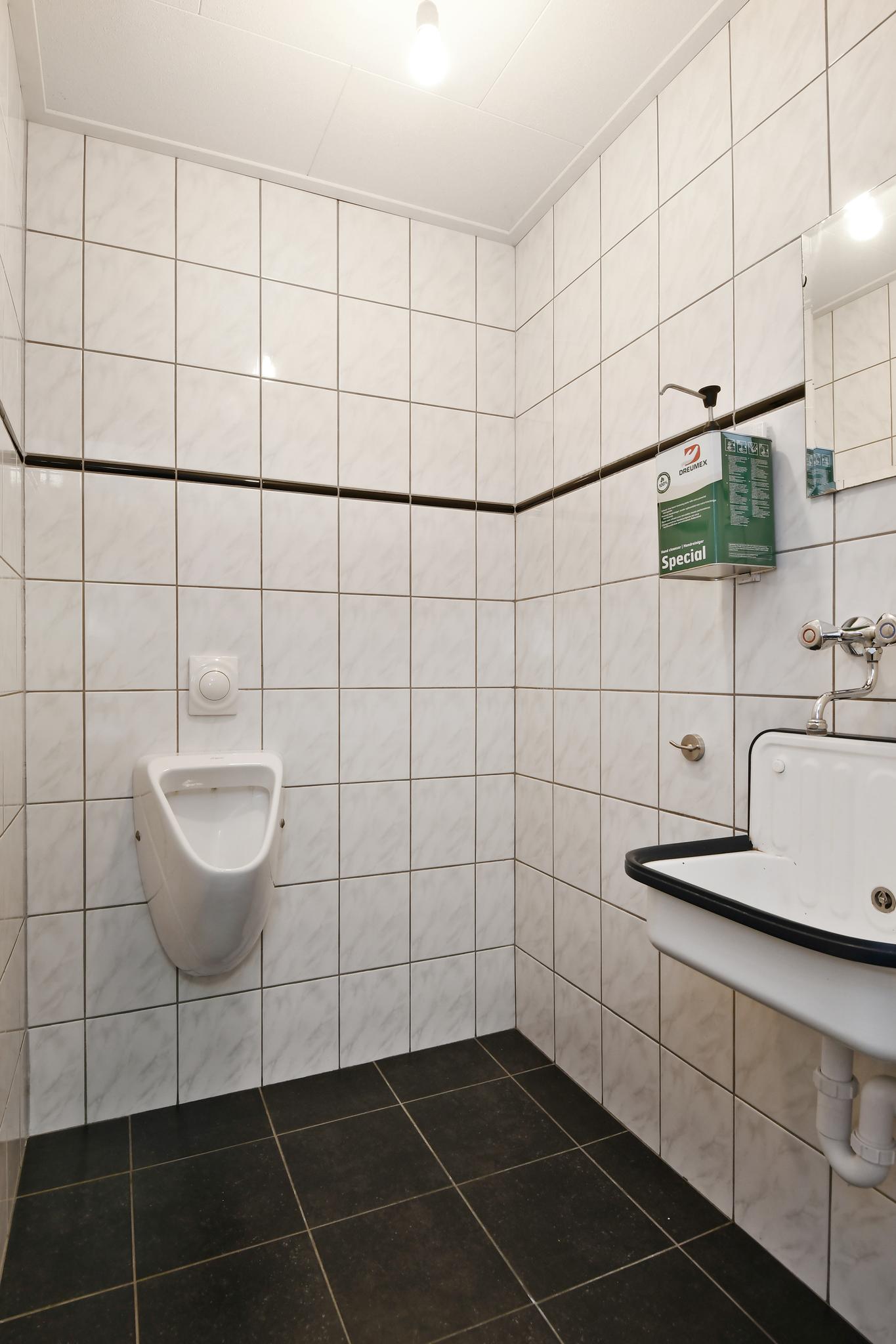 Open bedrijfsruimte met een elektrische overheaddeur (3,4m x 4,0m), meterkast, trapopgang, bergruimte en kantine. Kantine met een keukenmeubel en toegang tot een sanitaire ruimte. Geheel betegelde sanitaire ruimte met een wastafel, urinoir en apart toilet met inbouwcloset.