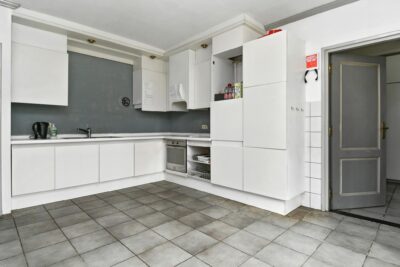 Aparte keuken met tuindeuren en een keukenmeubel in hoekopstelling met inbouwapparatuur. Vanuit de keuken toegang tot de bijkeuken.