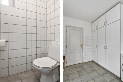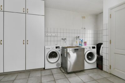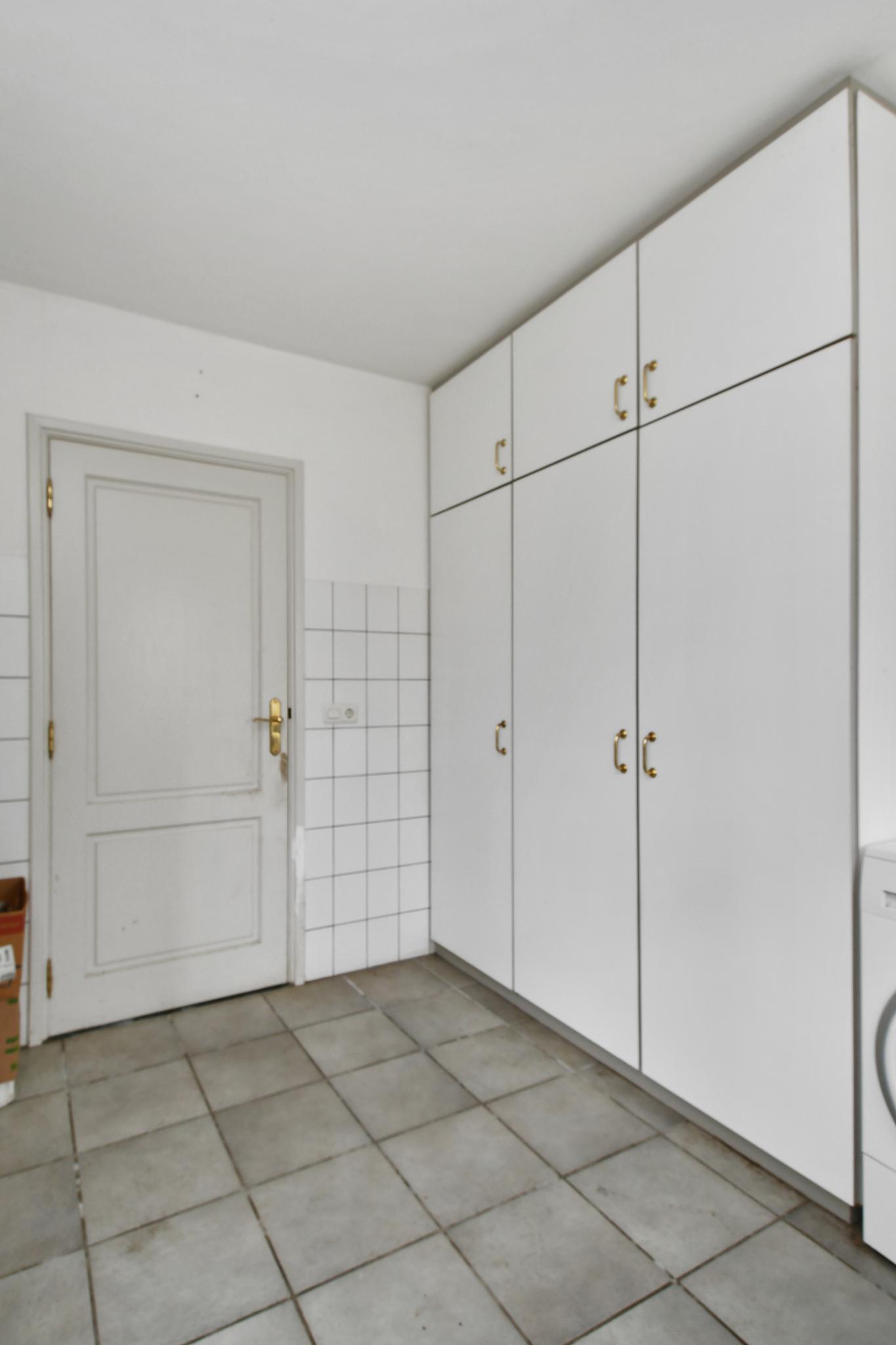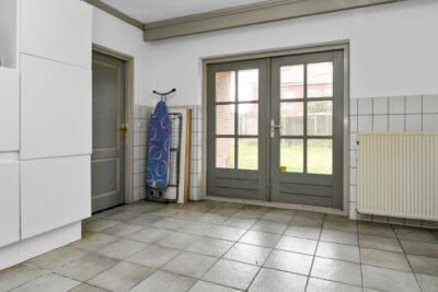 Bijkeuken met het toilet, een uitstortgootsteen, de aansluitingen voor de wasmachine, deur naar de tuin en toegang tot de inpandige garage. Het toilet is geheel betegeld en voorzien van een closet en fonteintje.