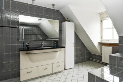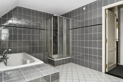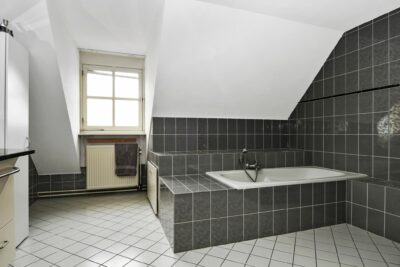 Geheel betegelde badkamer met een ligbad, douche, wastafel in meubel en dakkapel. Apart geheel betegeld toilet met een closet en fonteintje.