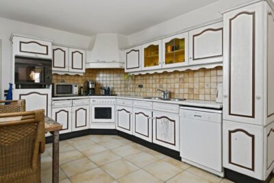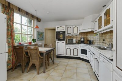 Aparte keuken met een keukenmeubel in hoekopstelling. Aansluitend aan de keuken toegang tot een bijkeuken met de aansluitingen voor de wasmachine en een deur naar de tuin.