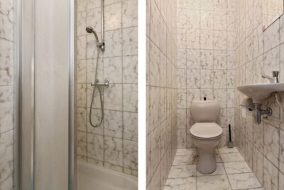 Geheel betegelde badkamer met een ligbad, douche, toilet en vaste wastafel. Apart deels betegeld toilet met een staand closet en fonteintje.
